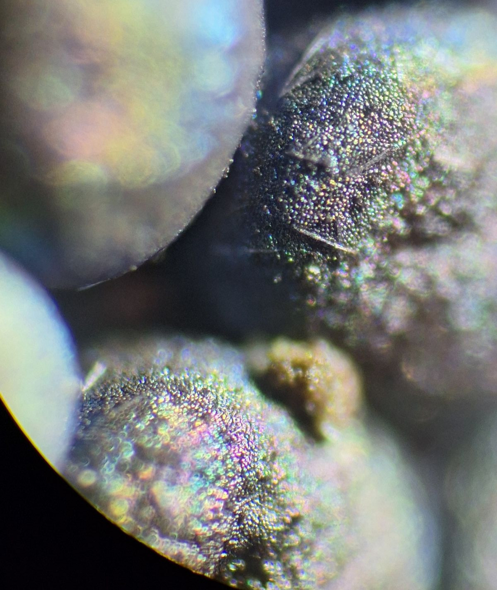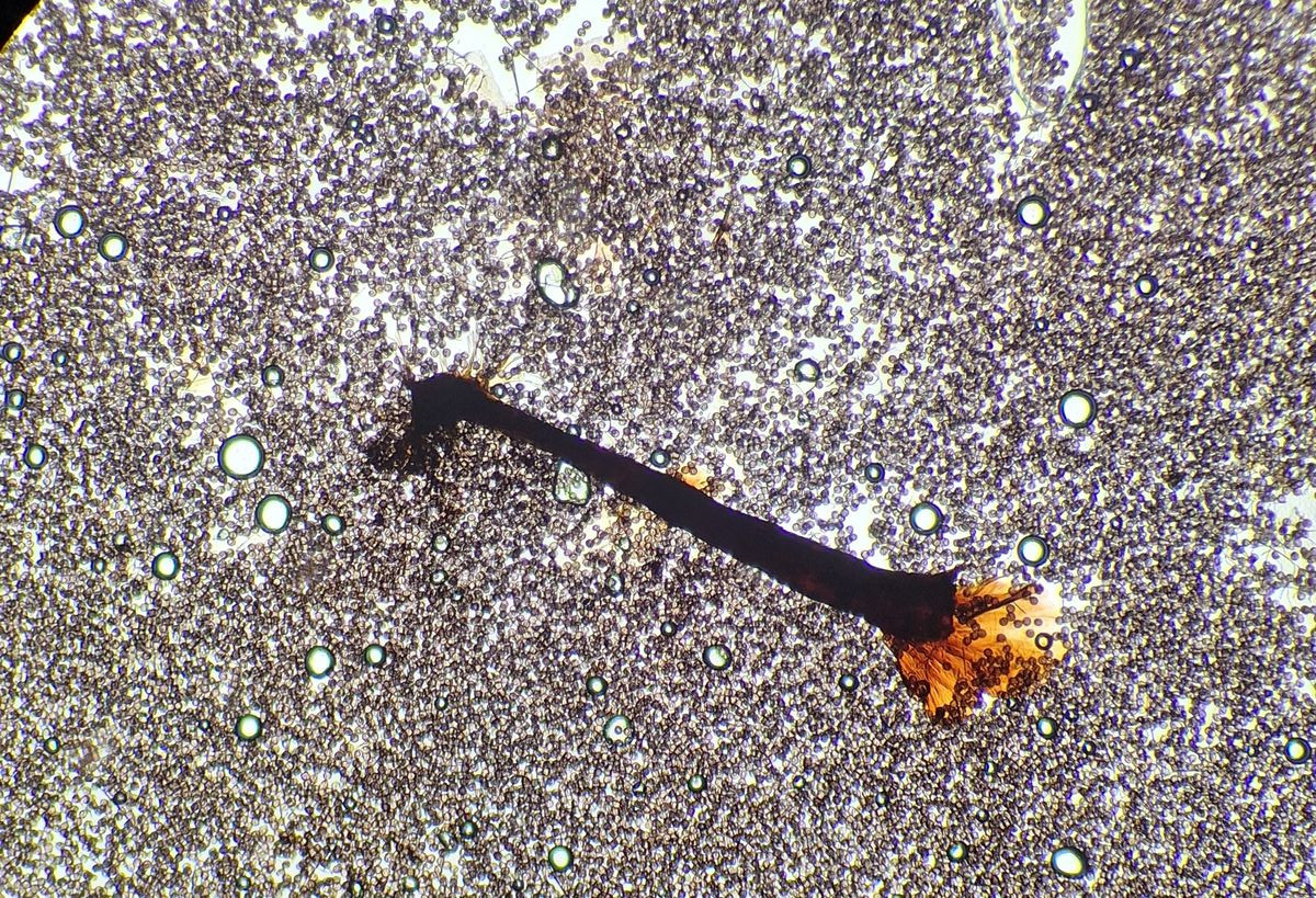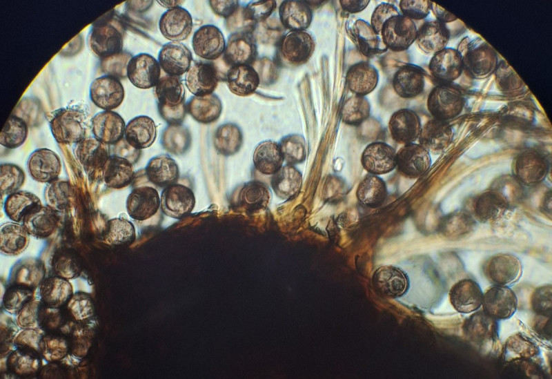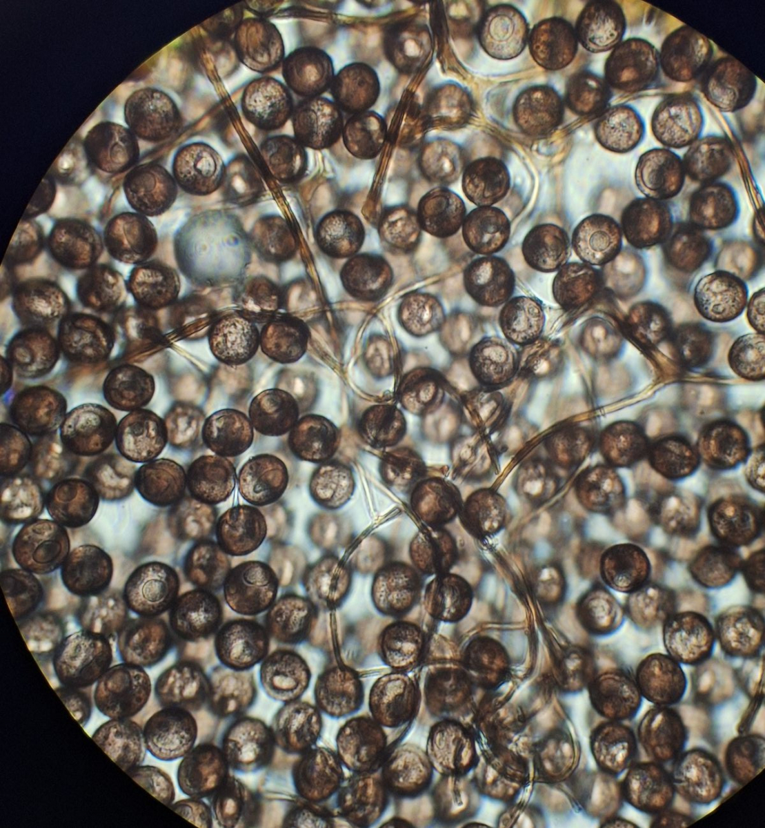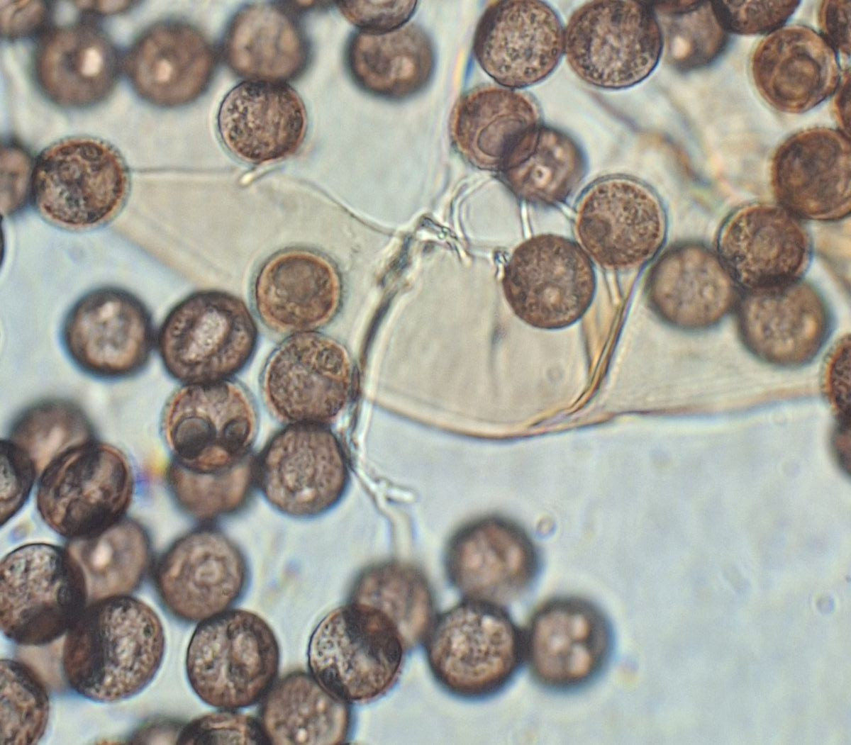 Sporen 9-10 µm, rund, unregelmäßig mit Blasen/Tropfen versehen, Fragment der Hülle