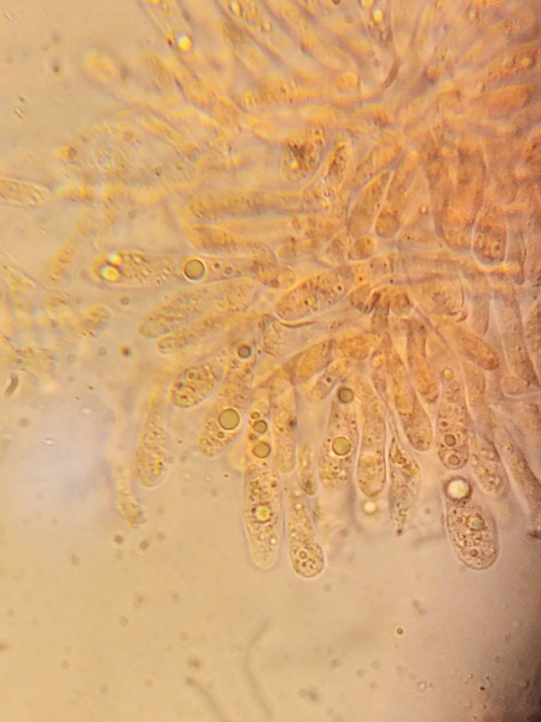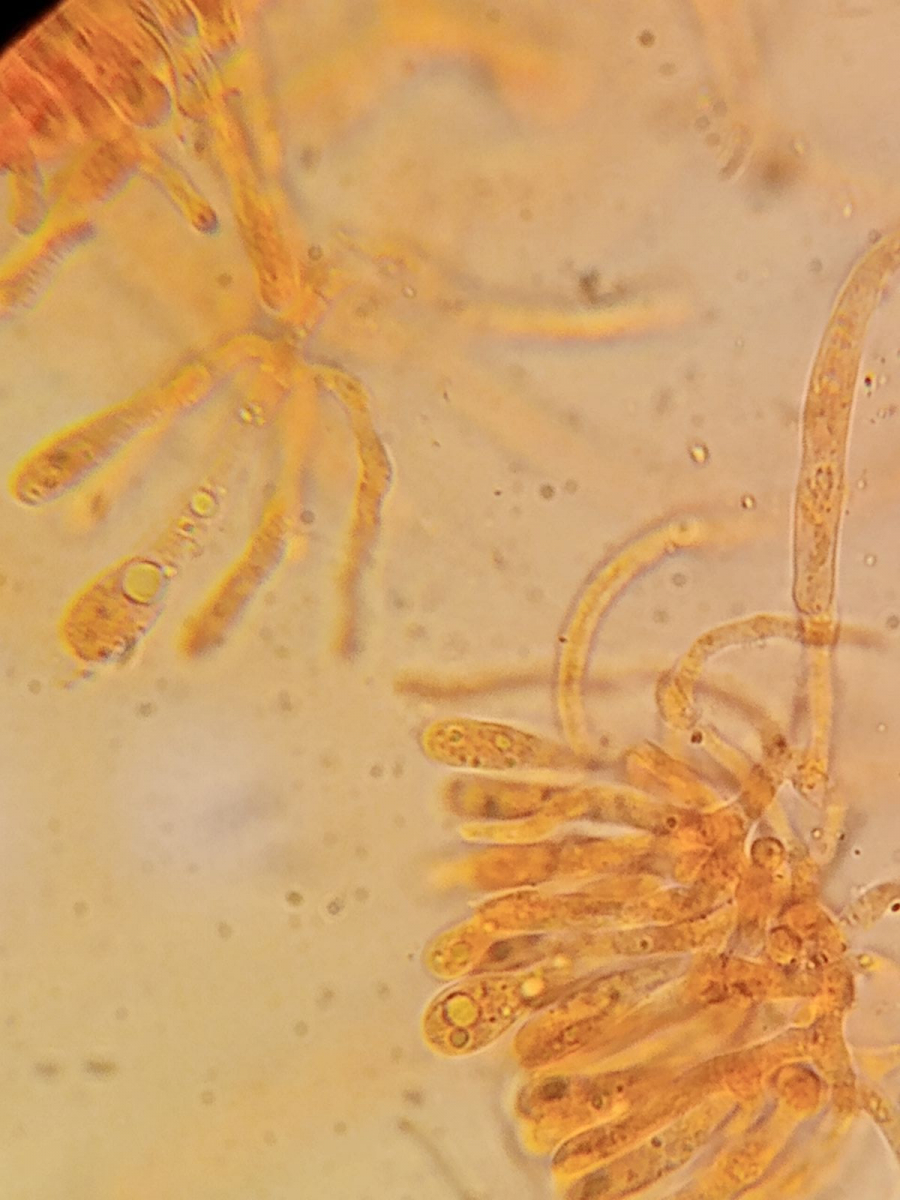 Die Interpretation des Gesehenen finde ich, trotz der Vergleiche mit der Literatur, extrem schwierig. Sporen kann ich schon, gab es in diesem Präparat aber nur vereinzelt. Das ist aber ja auch gut mit Basidiolen in Einklang zu bringen.