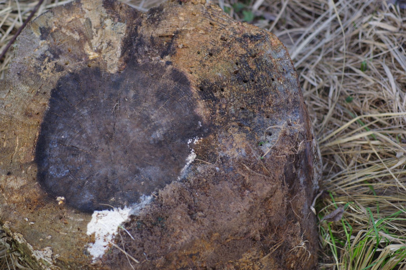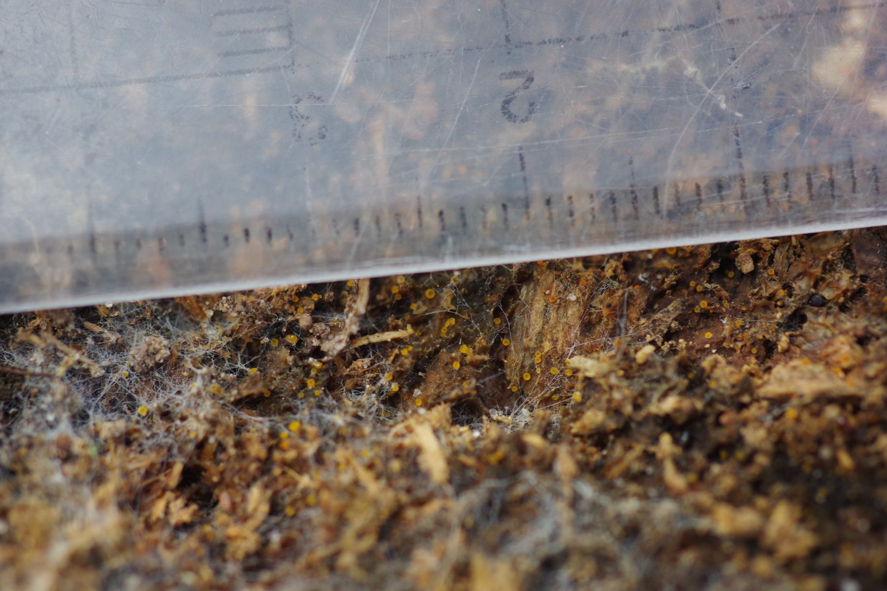 auf einem Kiefernklotz, der im Gras liegt, wächst ein winziger grelloranger Becher, so bis 0,3 mm groß.
