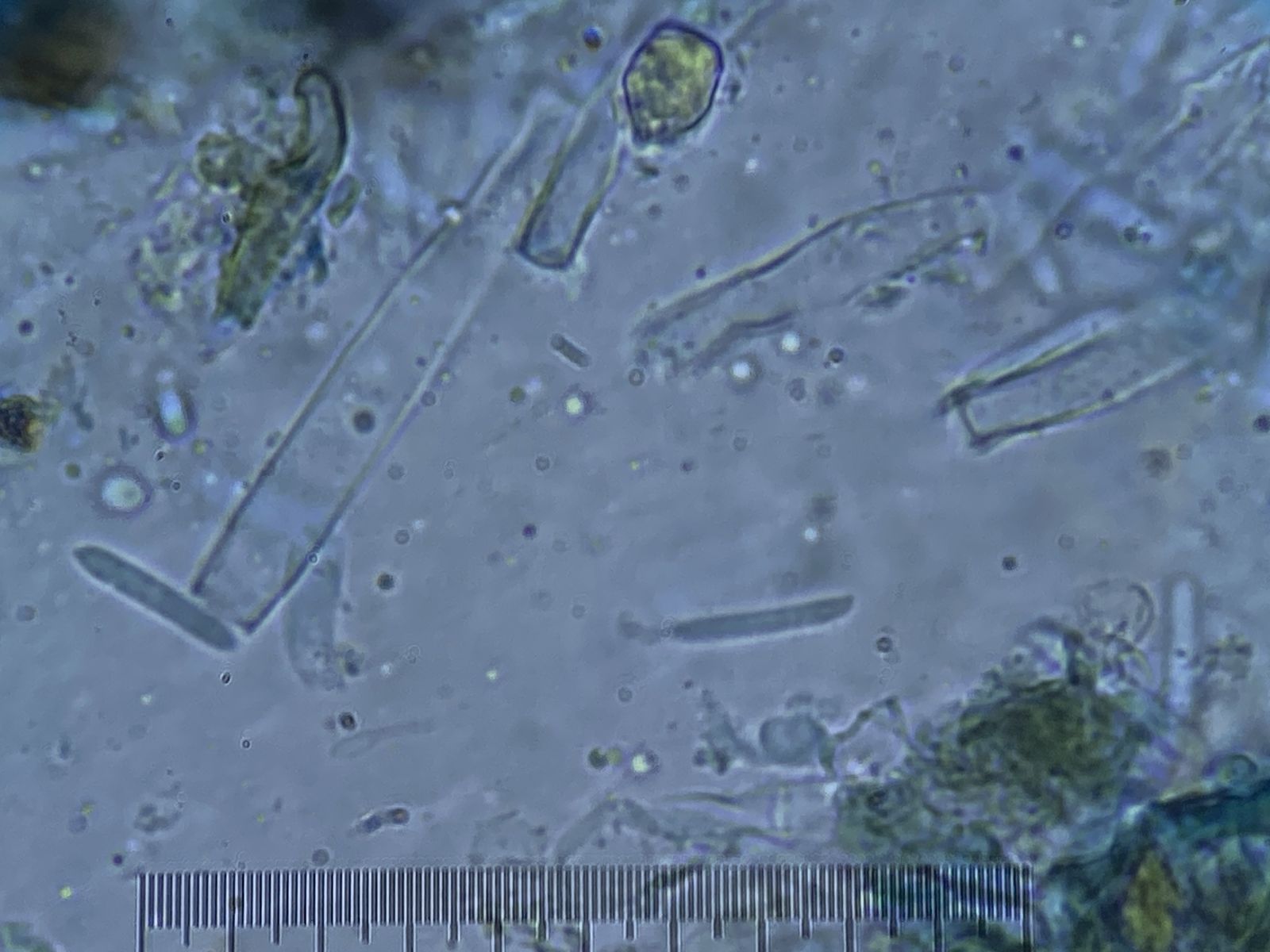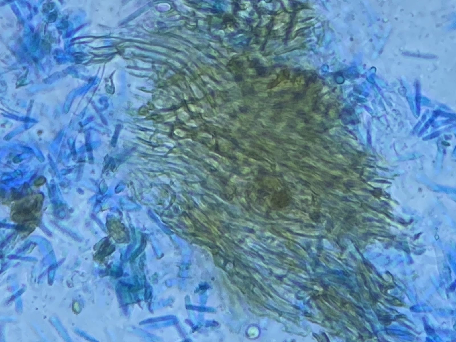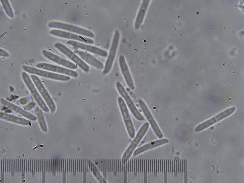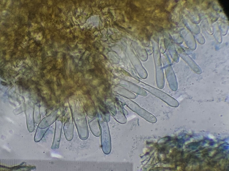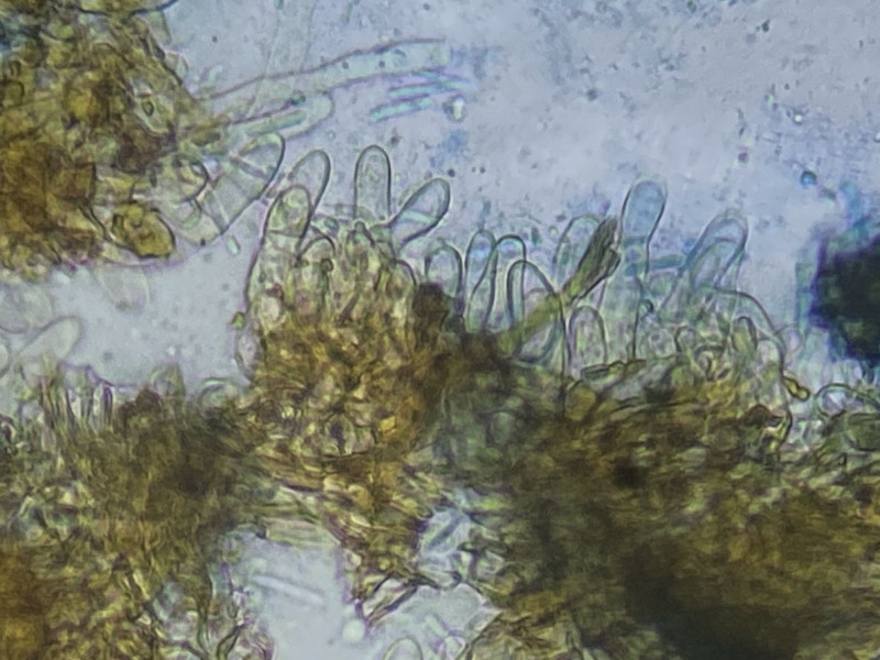 auf altem Laubholz in einem Komposthaufen (Efeu oder Buchs) sah ich diesen für mich unbekannten Pilz. Die Sporen/Konidien waren in Unmengen vorhanden [(8)9-12(15) x 1,5-2,5 µm, 0 oder 1 mal septiert]; leider sah ich keinen Ursprung. Es waren auch leere Asci oder Zystiden zu sehen (15-60 x 6 µm). Ich tippe mit Vorbehalt auf Ascomycet, weshalb ich diesen Bericht hier einstelle. Aber es könnte aus etwas anderes sein. Basidien, Hyphen oder Schnallen sah ich nicht. Vermutlich sind die Kulturen schon zu alt.