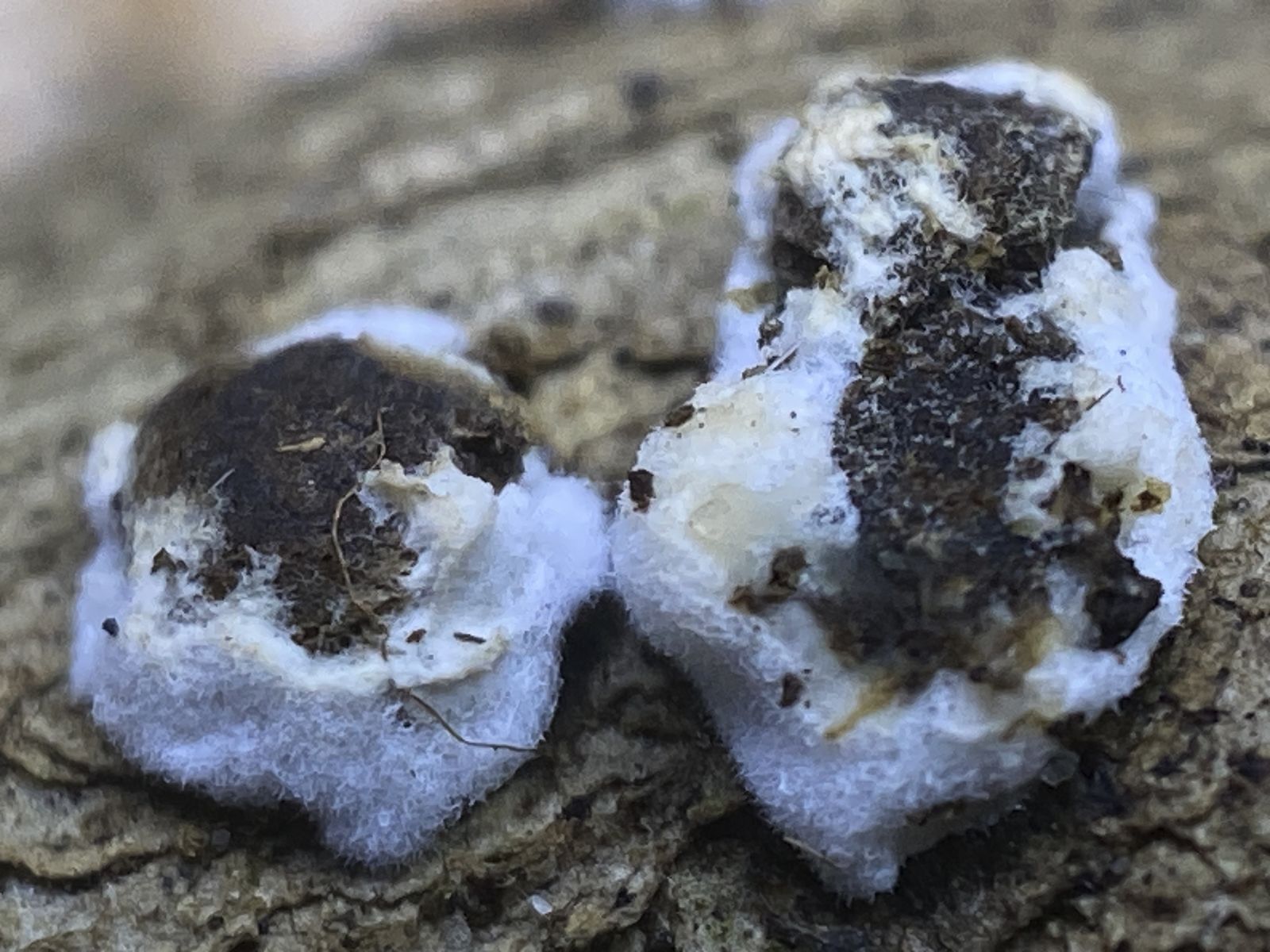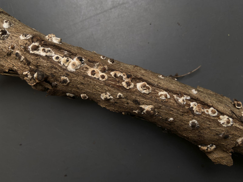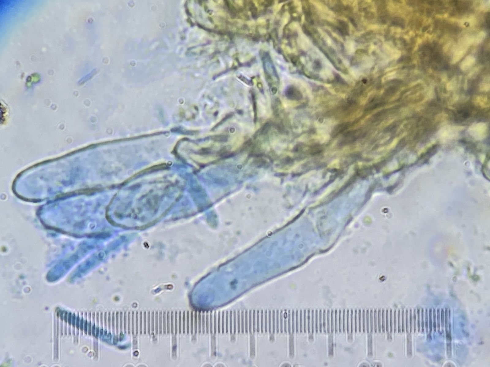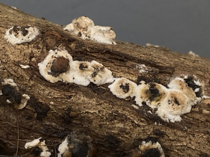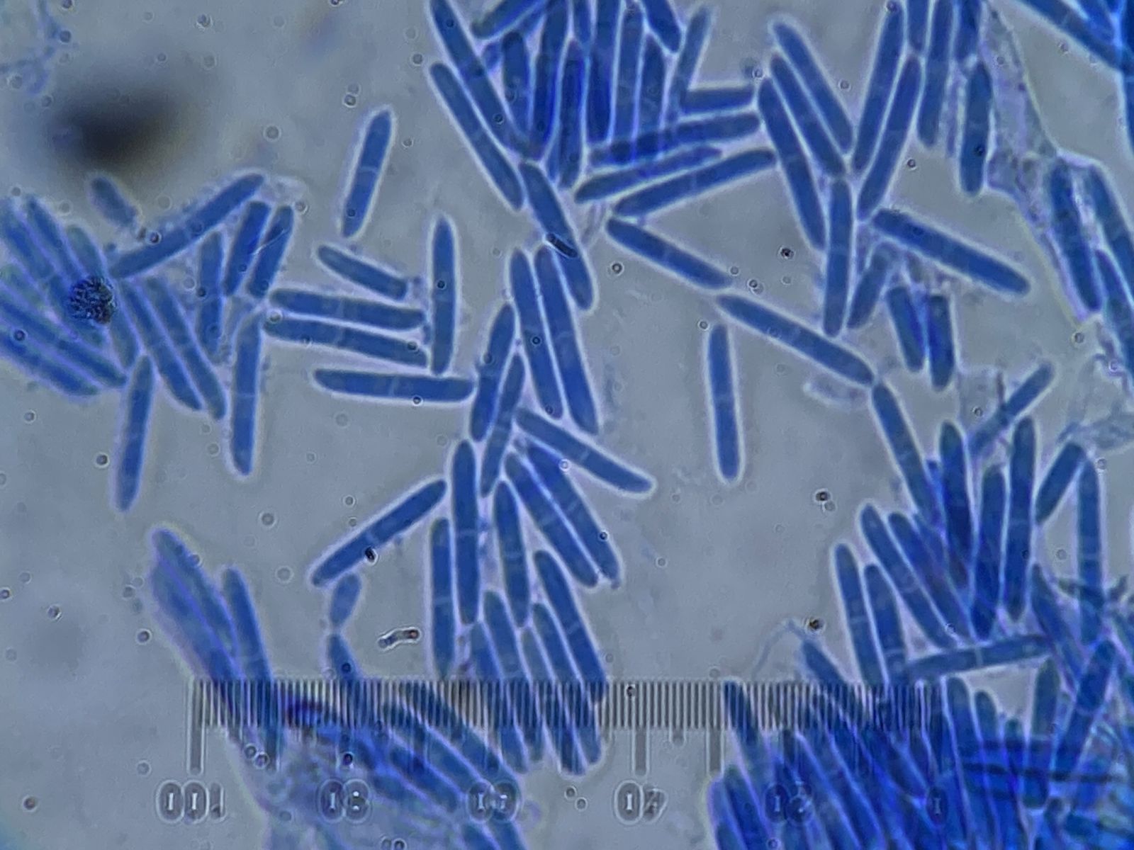 auf altem Laubholz in einem Komposthaufen (Efeu oder Buchs) sah ich diesen für mich unbekannten Pilz. Die Sporen/Konidien waren in Unmengen vorhanden [(8)9-12(15) x 1,5-2,5 µm, 0 oder 1 mal septiert]; leider sah ich keinen Ursprung. Es waren auch leere Asci oder Zystiden zu sehen (15-60 x 6 µm). Ich tippe mit Vorbehalt auf Ascomycet, weshalb ich diesen Bericht hier einstelle. Aber es könnte aus etwas anderes sein. Basidien, Hyphen oder Schnallen sah ich nicht. Vermutlich sind die Kulturen schon zu alt.