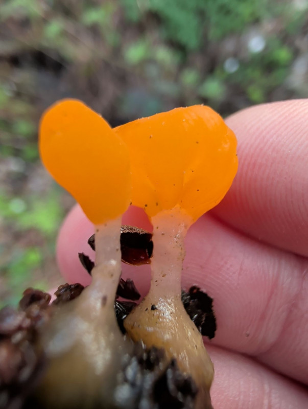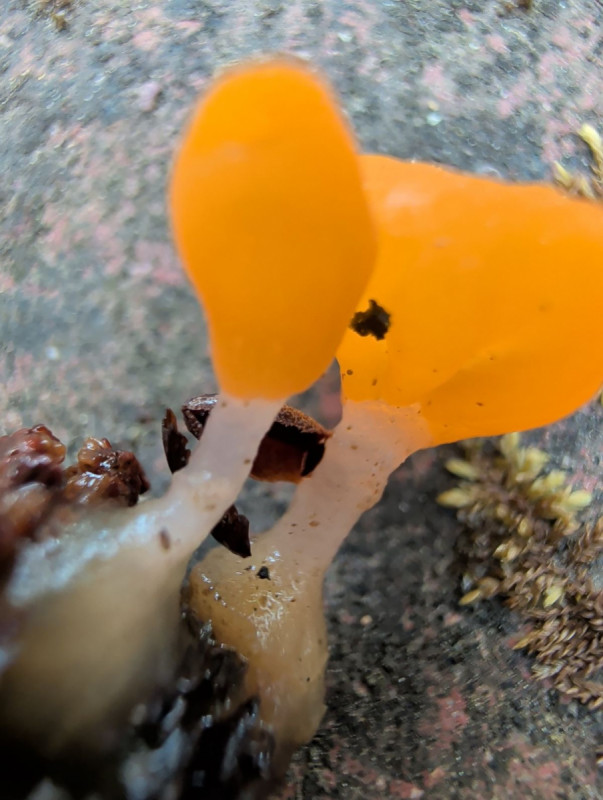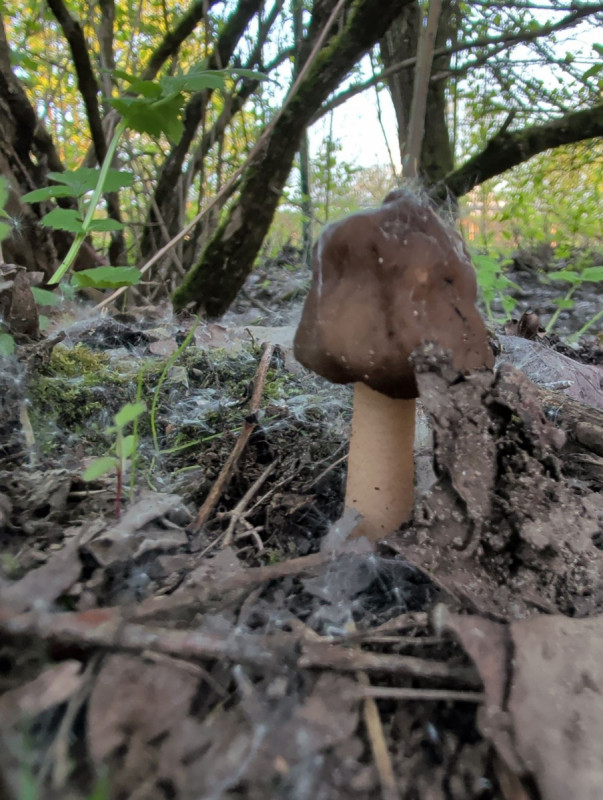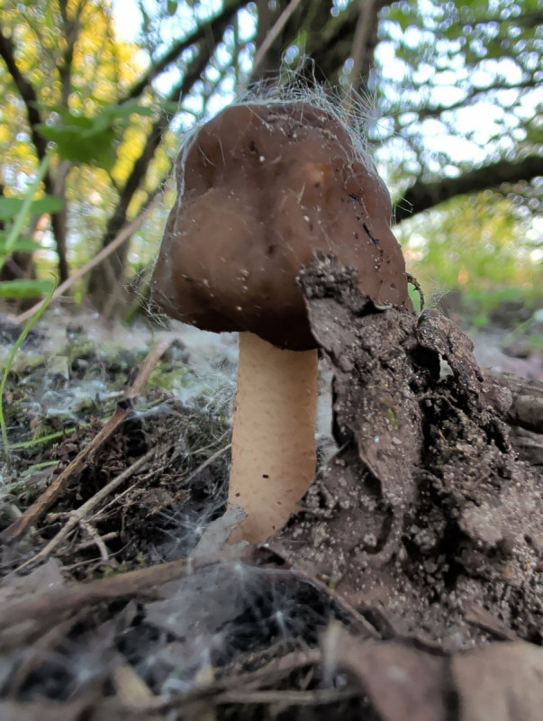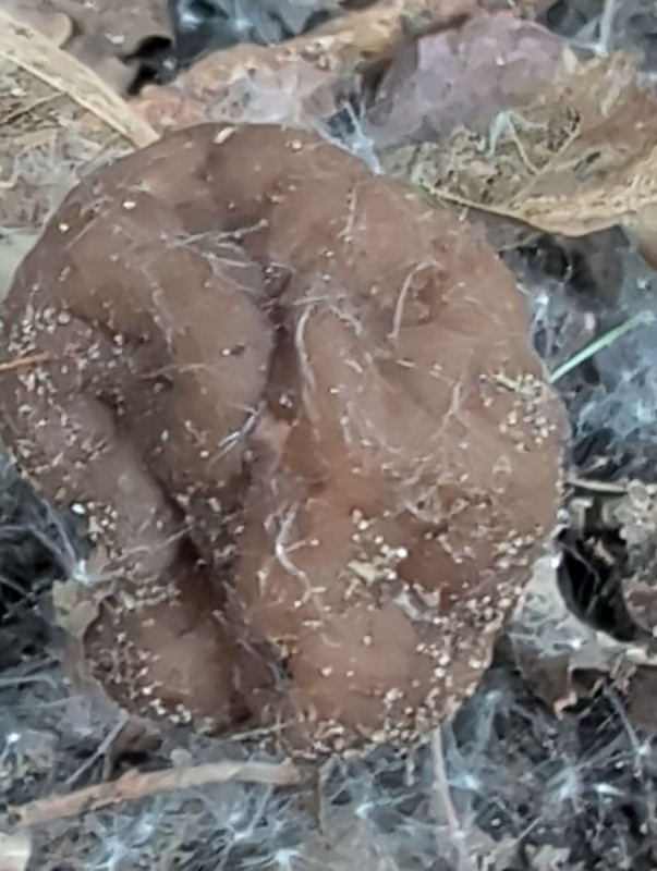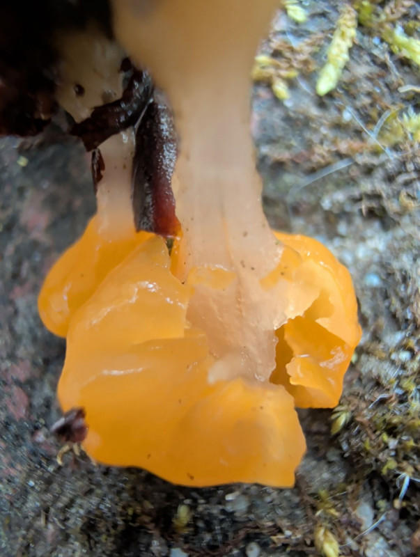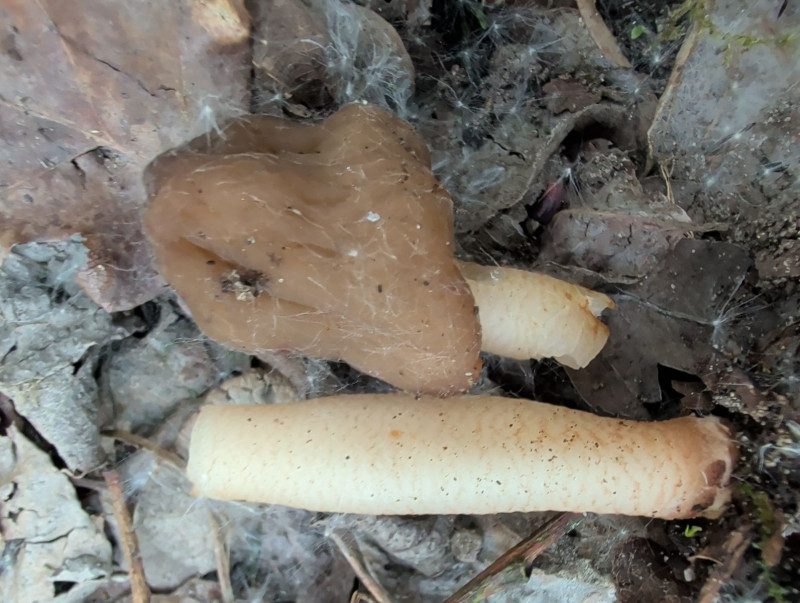 Da standen ca 10 Fruchtkörper unterschiedlicher Größe. Das auf den Bildern ist schon der größte. Ich war nicht auf Pilzsuche, daher hatte ich kein Messer und habe versucht, ein "Schnittbild" mit den Fingern zu machen, was den Hut aber lediglich zerquetscht hat...