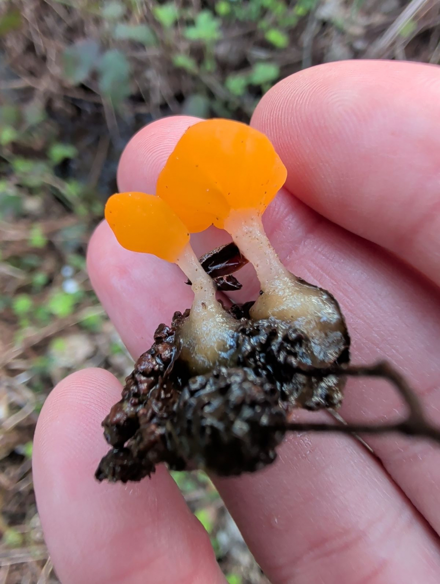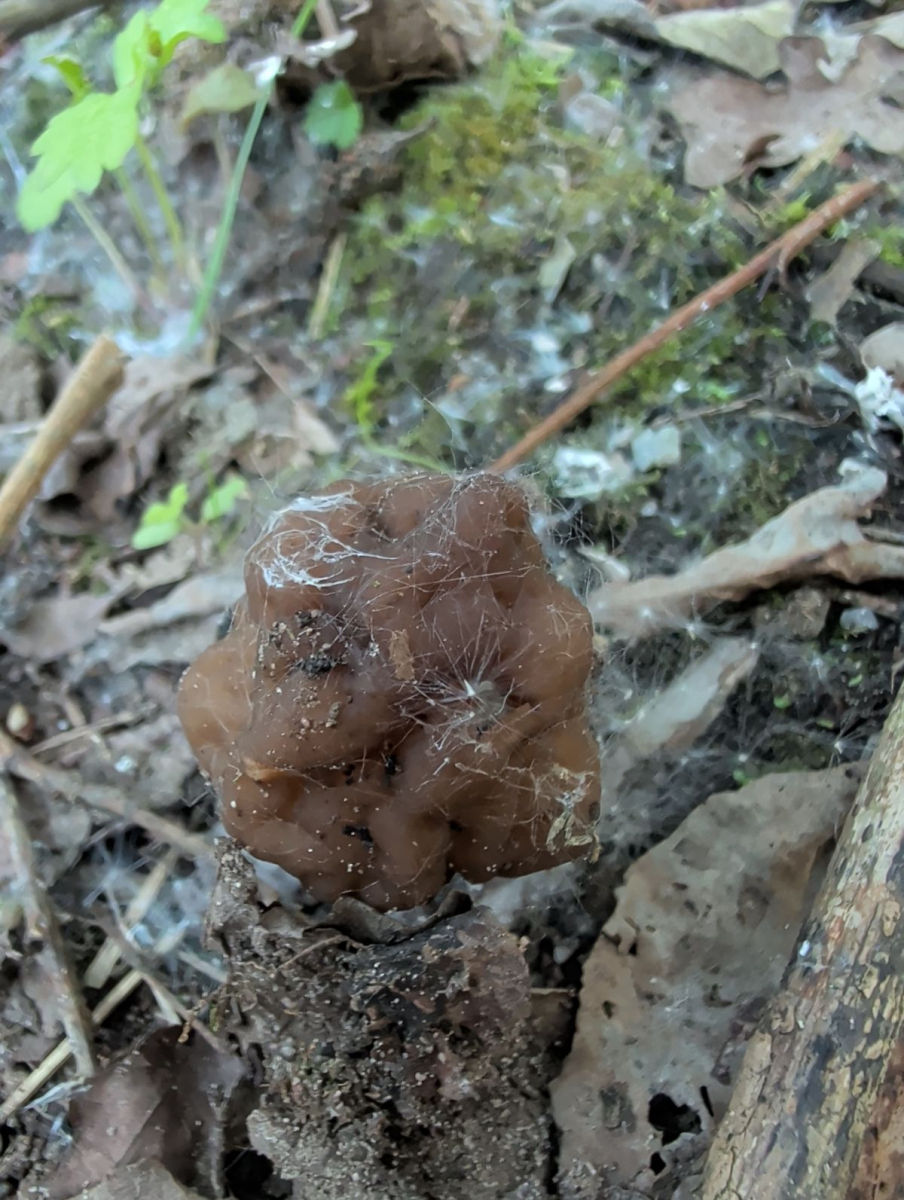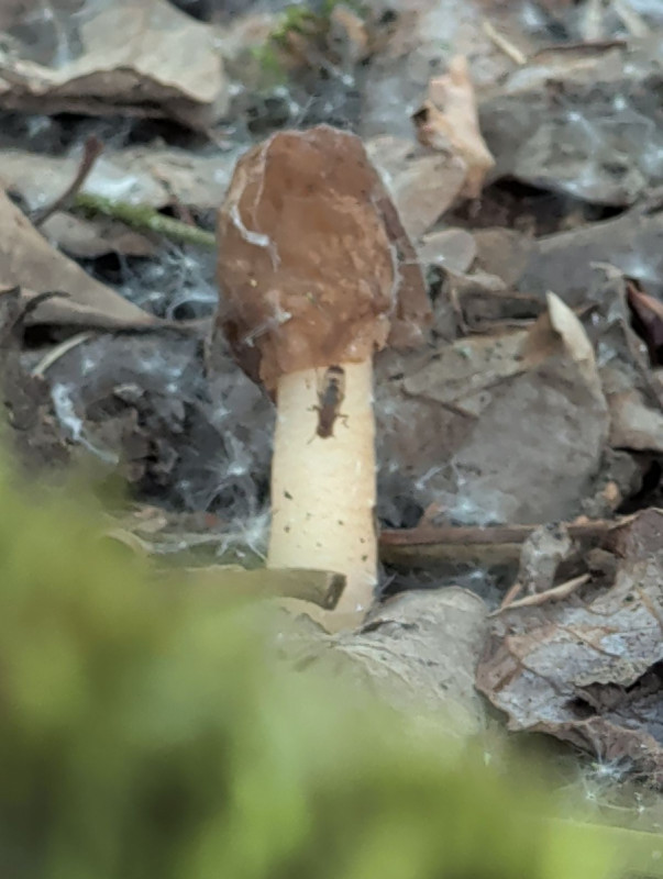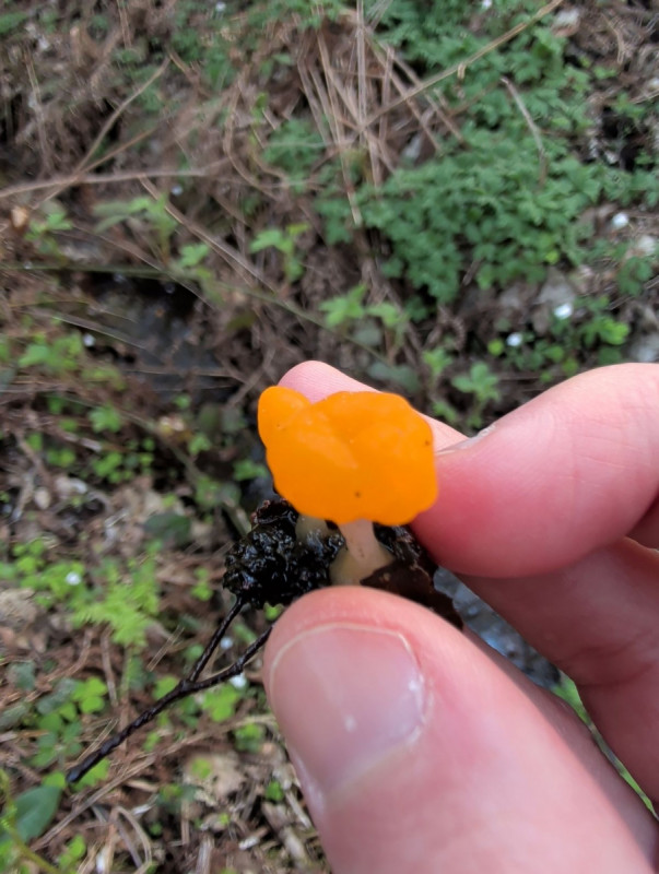 Da standen ca 10 Fruchtkörper unterschiedlicher Größe. Das auf den Bildern ist schon der größte. Ich war nicht auf Pilzsuche, daher hatte ich kein Messer und habe versucht, ein "Schnittbild" mit den Fingern zu machen, was den Hut aber lediglich zerquetscht hat...