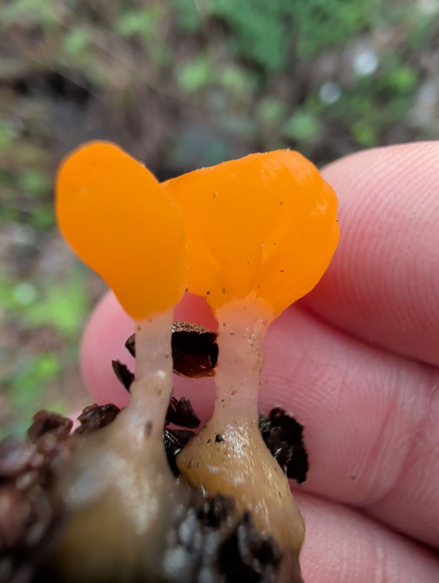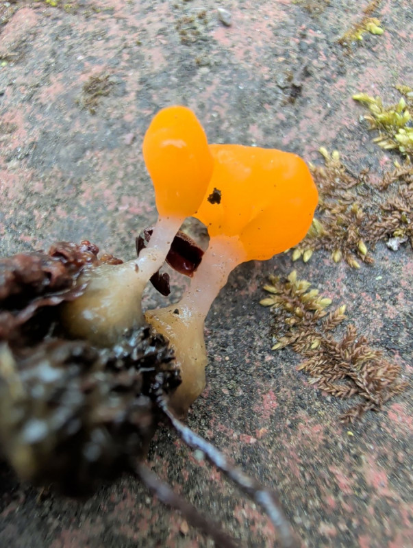 die Pilze mit gelbem Kopf sind Mitrula paludosa, ein typischer Frühlingspilz