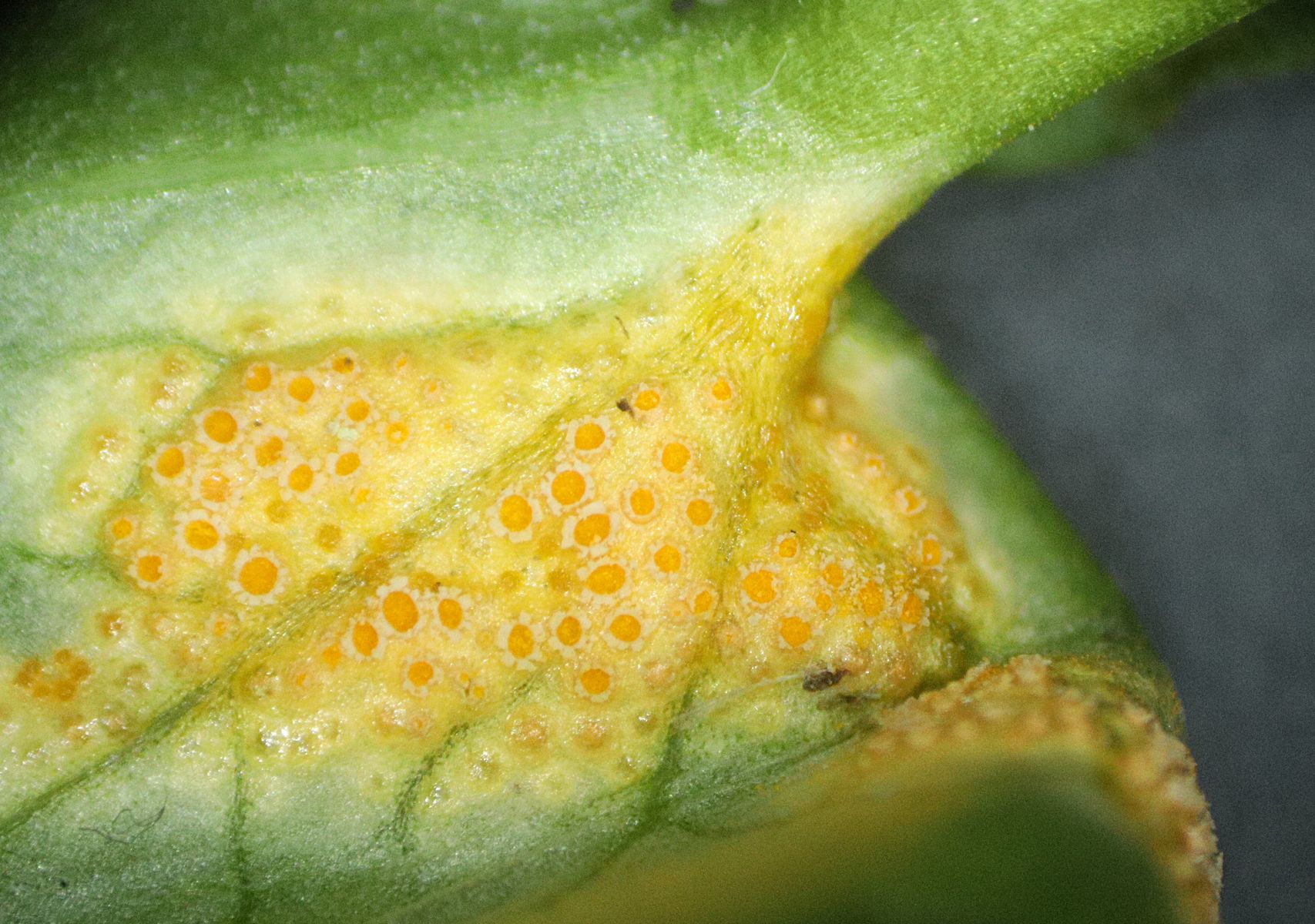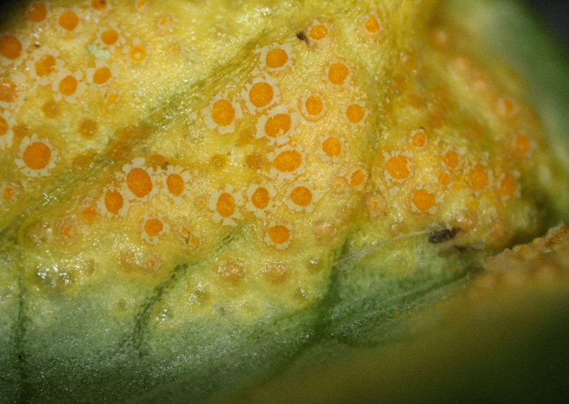 Schon im Stehen/Gehen, von oben auf die Blätter schauend, sieht man gelbe Flecken. Dreht man die Blätter um bzw. rupft sie raus und schaut sie mit der Lupe an, schaut das so aus: