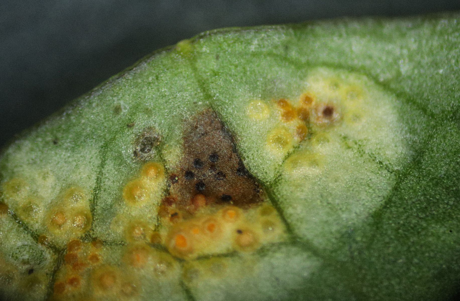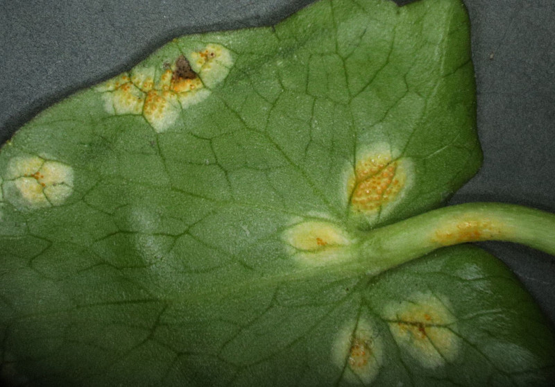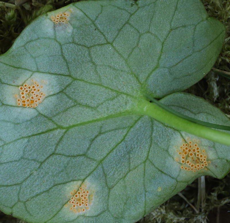 Blattunterseits sieht man Spermogonien und Aecien. Oben ist noch ein Blattfleck, den ich gleich thematisieren werde.