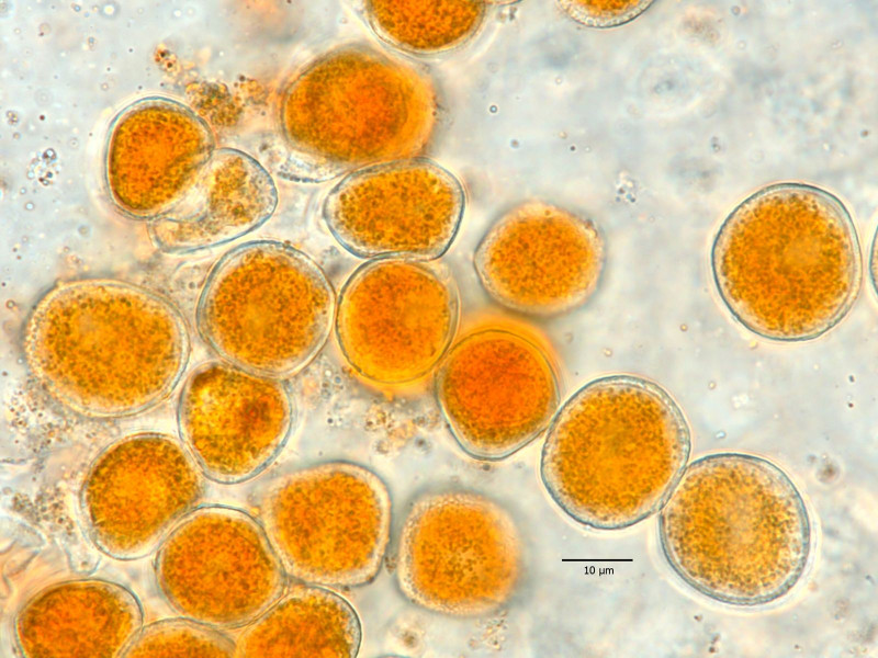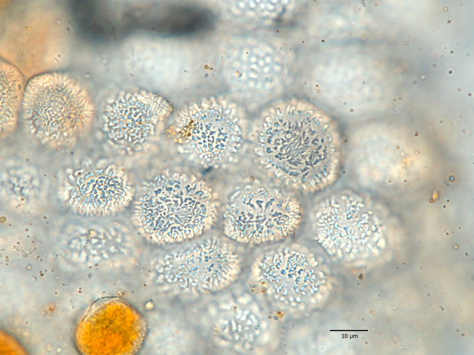 Die flachen, ornagefarbigen Flecken, die von den Aecien umgeben sind, sind wieder die Spermogonien. Hier sieht man es besonders gut, finde ich, daher das Foto vom letzten Jahr. Damit kann man Uromyces poae eigentlich schon mit der Lupe bestimmen. Sicherheitshalber schaut man sie aber die Aecidiosporen an. Die Sporenmaße, das Fehlen von sich ablösenden Plättchen an der Oberfläche und die feinwarzige Pberfläche bestätigen dann den Befund.