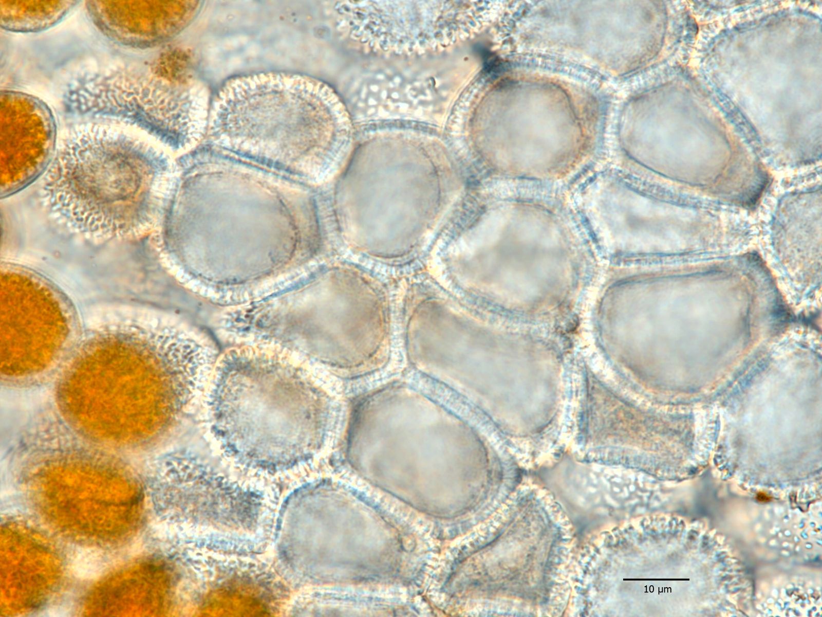 Die farblosen/farbarmen, stark ornamentierte Zellen Bilden den Rand der Aecien (was so schön kronenartig absteht). Die finde ich immer besonders hübsch.