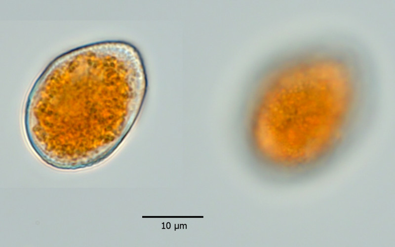 Hier eine Aecidiospore links im Querschnitt, rechts in Aufsicht (feinwarzige Oberfläche).
