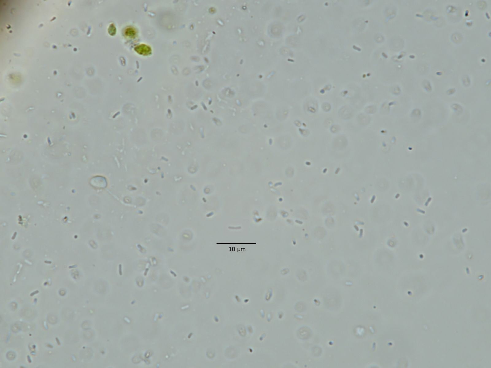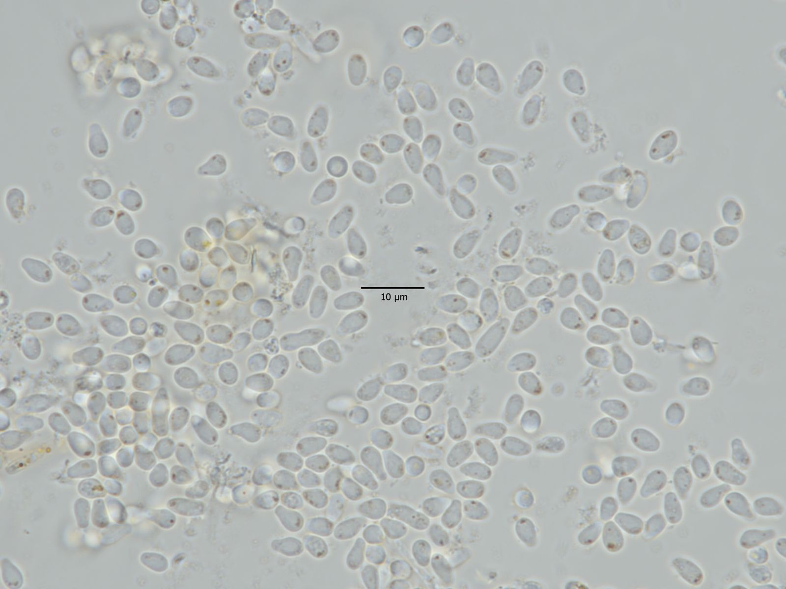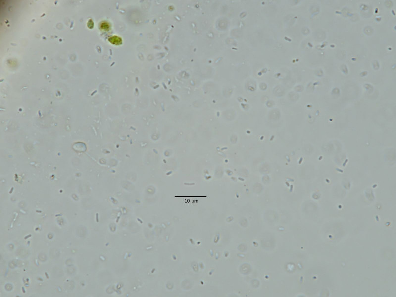 Kleine, schwarze Buckel auf der Blattunterseite auf einem Blattfleck. Sowas mag ich. Klingt verrückt, ist aber so. Hier war die Präparation aber herausfordernd. Genau genommen bin ich gescheitert. Ich wollte dünne Schnitte durch die winzigen Flecke schaffen, um die konidiogenen Zellen zu sehen. Hat aber nicht wirklich geklappt. Schnitt ging, aber trotzdem waren die Konidienträger dicht gepackt, dass sie nicht gut zu differenzieren waren. Also quetschen... das hat sie dann zerrissen. Entweder dicht gepackt oder kaputt... Konidien habe ich reichlich gesehen, aber auch das war so eine Sache. Sie sind winzig, um die 2,0 – 4,0 × 0,6 – 0,8 µm, also winzig. Das bedeutet, sie drehen sich, zappeln, zucken... schwierig zu fotografieren. Die Maximallänge ist schwer zu erkennen, da sie sich gleich wieder aus der Schärfeebene drehen.Ein Beispielfoto: