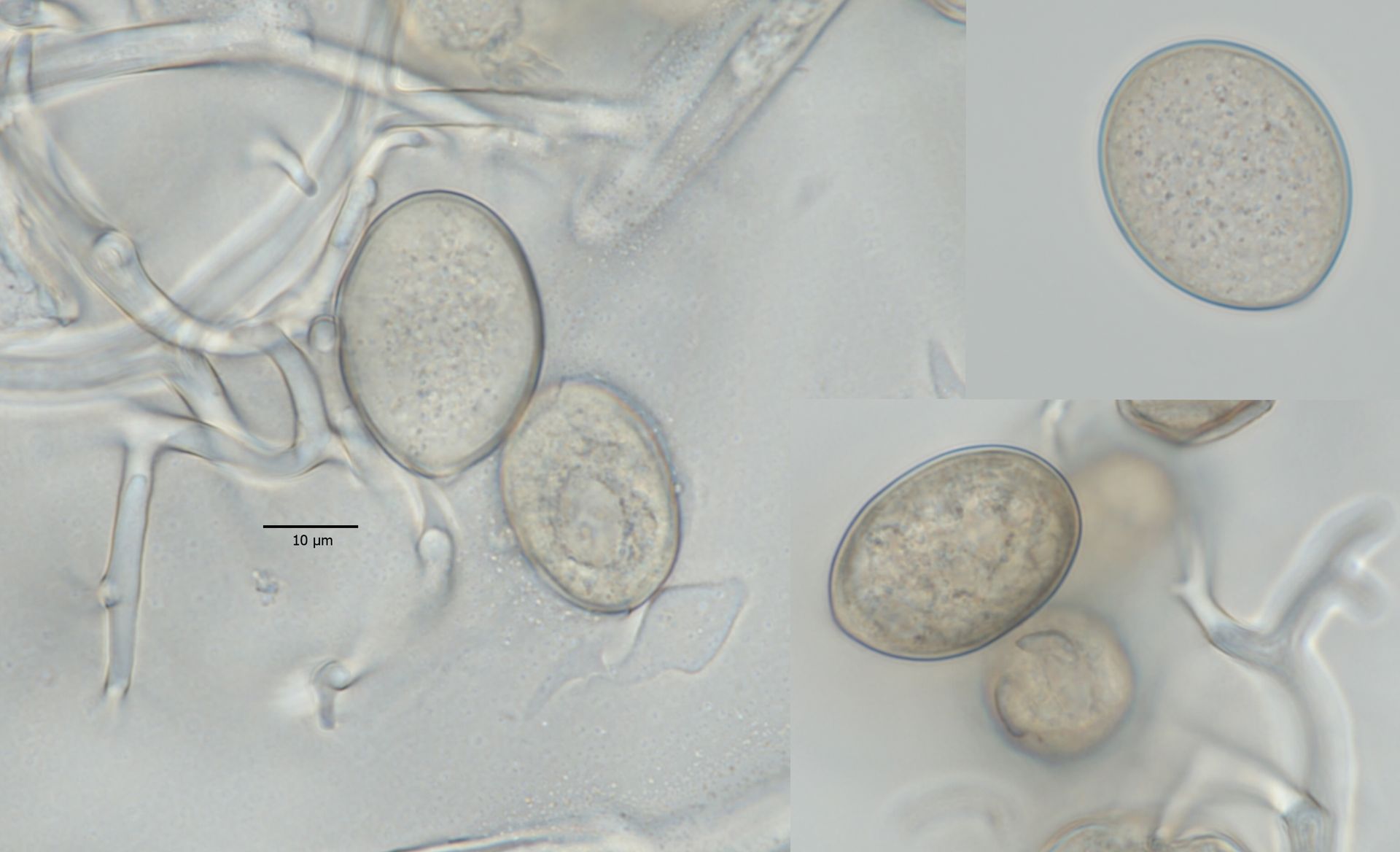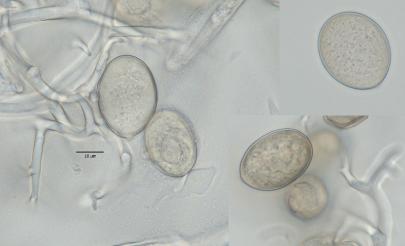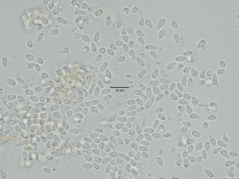 Als Maße ergibt das (n = 30): 11,0–14,4–171, × 7,1–8,4–10,3 μm. Damit ist Botrytis ficariarum raus! Und Botrytis cinerea, die ja an alles mögliche geht, auch raus. Es gibt eine Botrytis euroamericana, die auch an diverse Wirte geht und die eher so große Konidien ausbildet. Ich habe daher erstmal nur für mich intern den Arbeitsnamen Botrytis cf. euroamericana gewählt. Ich habe leider nur ein einziges, betroffenen Blatt gefunden – für einen kleinen Beleg reicht es so gerade. Wenn ich das zum Sequenzieren gebe, ist kaum nich was übrig und daheim kultivieren kann ich nicht. Insofern kann ich nur indie Runde fragen, ob jemand hier schonmal so eine Botrytis an Scharbockskraut gefunden hat oder sowas kennt. Für sachdienliche Hinweise bin ich immer dankbar.