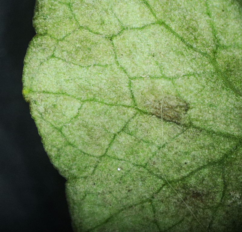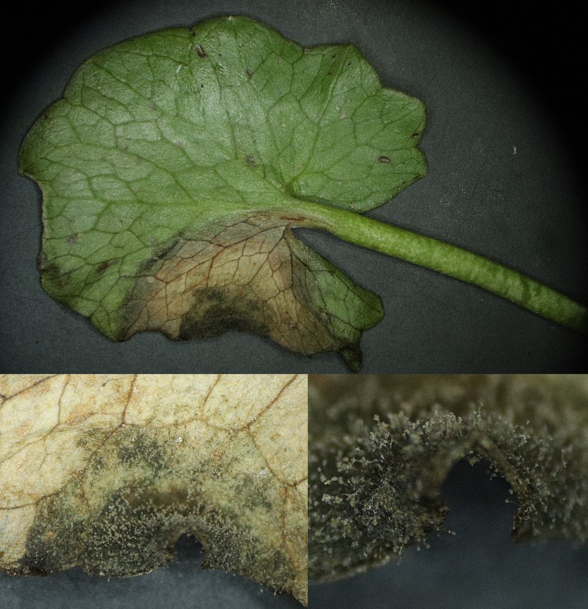 Unterseits eines Blattflecks ist der dunkle "Schimmel" zu sehen. Bekannt ist z. B. Botrytis cinerea an Erdbeeren. Sieht im Prinzip genauso aus. Die Präparation war auch nicht einfach, da selbst bei der Tesafilmethode die Konidienträger sofort kaputt gingen. Einen habe ich aber, abgesehen von Lufteinschluss, hinbekommen: