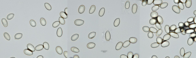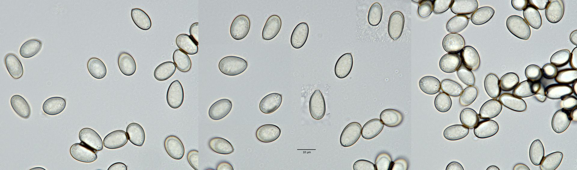 Ich habe mehrfach präpariert, bis am Ende keine schwarzen Punkte mehr übrig waren. Bei der Bestimmung komme ich wegen der winzigen Konidien und der schwarzen Pyknidien an Blattflecken auf die Gattung Asteromella. Der aktuelle Schlüssel von Klenke & Kruse führt mich dann zu Asteromella ranunculi (nur soll der auf anderen Ranunculus-Arten und nicht an Ficaria vorkommen). Sehr gut passen die Sporenmaße bei Klenke & Kruse, aber in der Bearbeitung von Ruszkiewicz-Michalska (2016) – siehe https://www.researchgate.net/p…ungi_Ascomycota_in_Poland – werden längere Konidien angegeben. Demnach würde Asteromella ranunculi 5–5,5(–6,0) × 1 µm große Konidien haben, die von Asteromella trolli würden etwas besser passen, aber Scharbockskraut ist keine Trollblume. Klenke & Kruse geben 2–3 × 0,7–1,5 μm als Maße für Asteromella ranunculi an, wobei an Scharbockskraut eine unbeschriebene Art vorkommen soll, deren Konidien mit 5–7,4 × 1,7–2 μm deutlich größer sind.