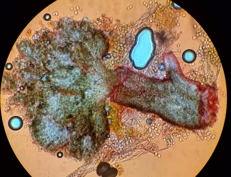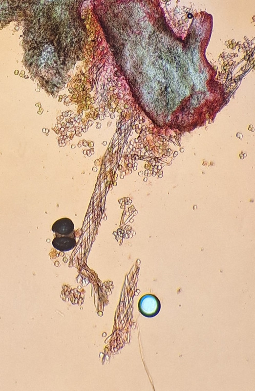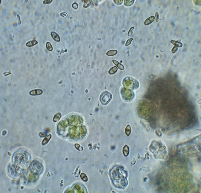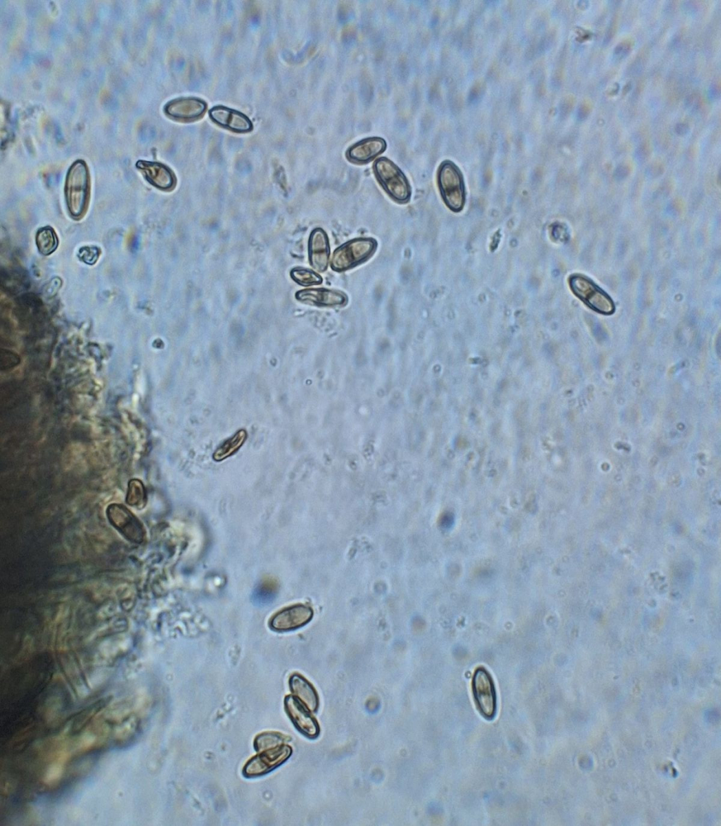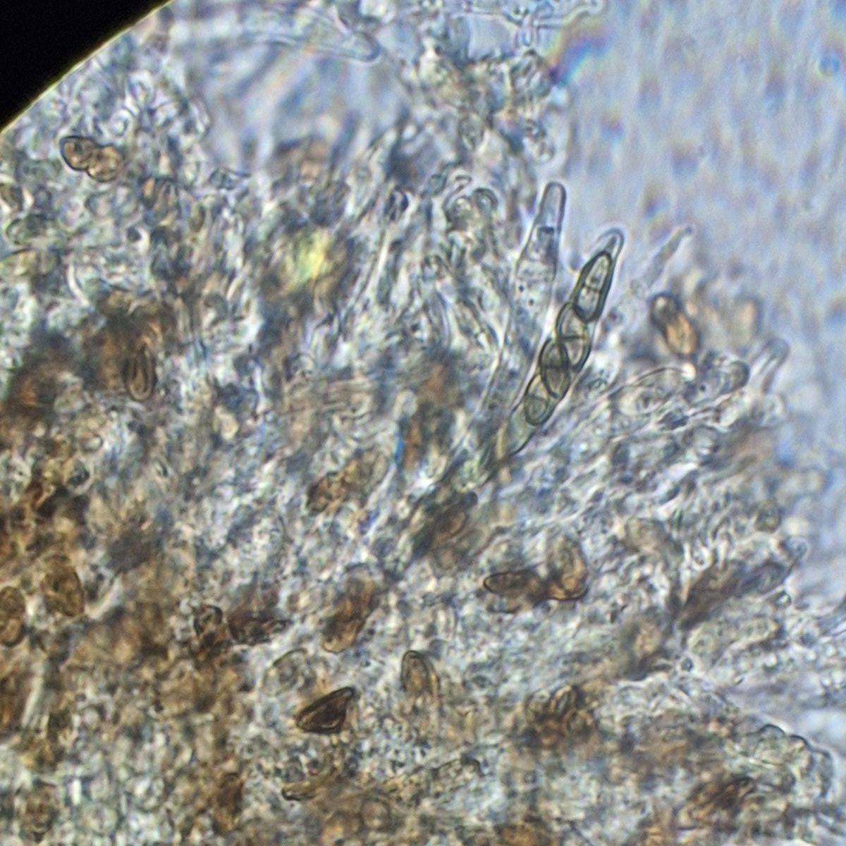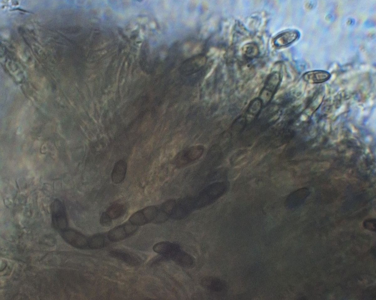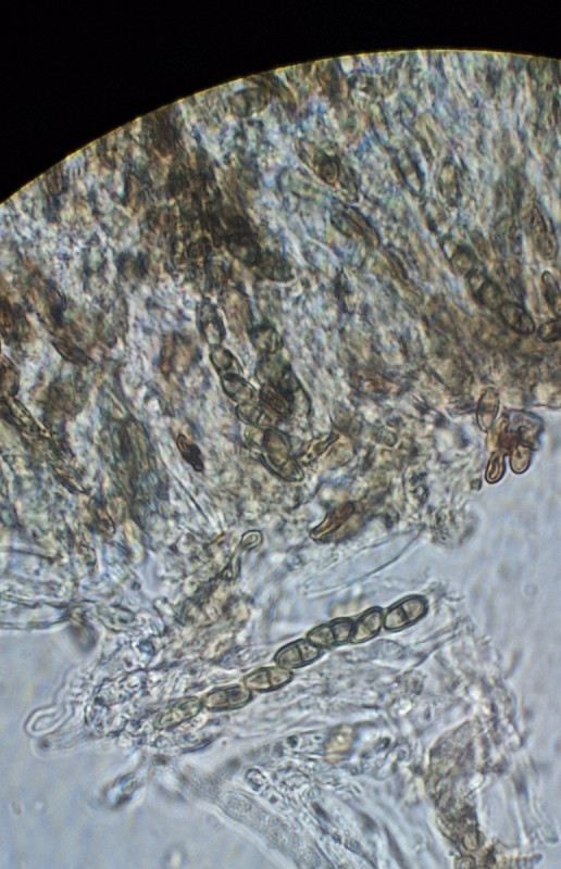wie auf dem Makrofoto zu sehen ist, wachsen die in Algenpolster bzw. das Algenpolster auf denen - die Reihenfolge ist mir nicht klar. Die Sporen sind deutlich septiert, teils eingeschnürt, bräunlich,
