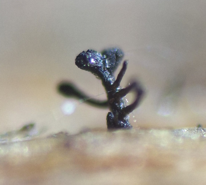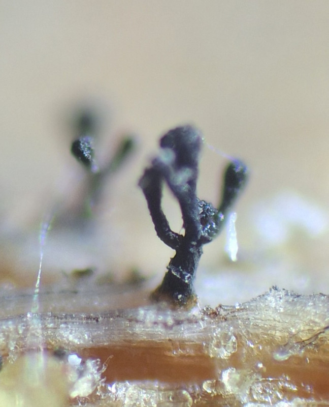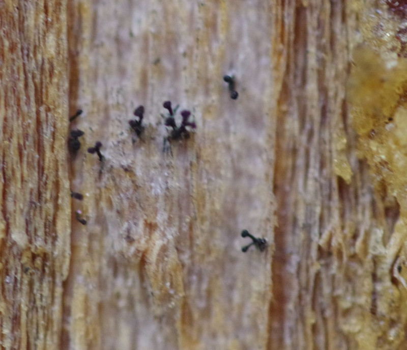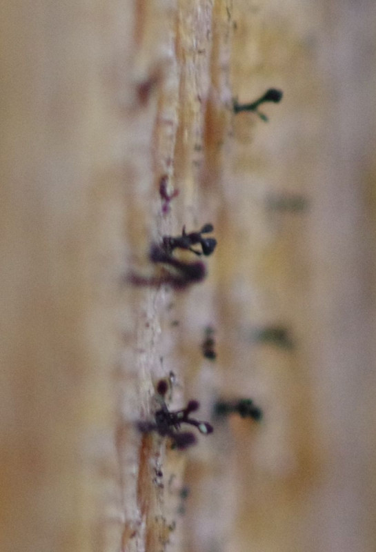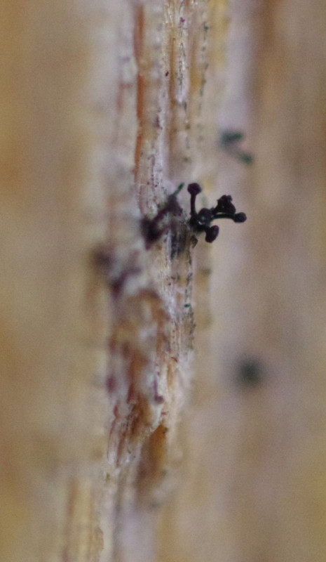 eine habe ich noch. Wieder vom Hof, von der Saunatür, die aus diesem Jahrtausend stammt und eigentlich nicht zu den typischen Substraten gehört - mit Ausnahme der sehr schnellen Pionierart Mycocalicium subtile. Sehr klein, bis 0,3 mm hoch, mit bloßem Auge kaum zu sehen, wären da nicht diese Büschel. Das Brett ist Kiefer und ziemlich harzig (deswegen farbecht erhalten im Vergleich zu Fichte rechts und links davon), weswegen ich beim Schlüsseln auch die Arten auf Harz, harzigem Holz einbezogen haben - nur haben die fast alle unseptierte Sporen. Es könnte, wie auch auf dem Haus Ch. debilis sein, nur eben mit abweichender, krass verzweigter Wuchsform.