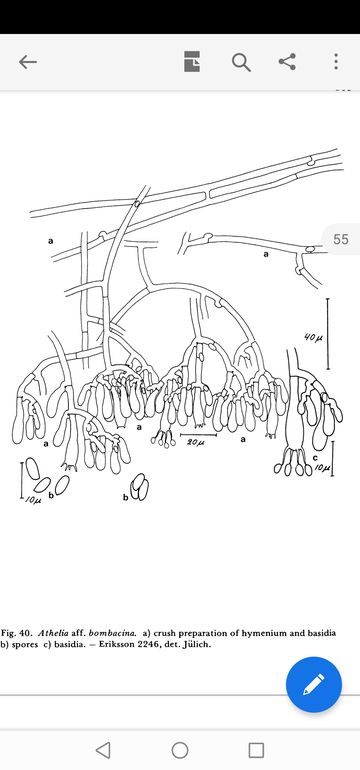 Regel Nummer 1 des wissenschaftlichen Arbeitens: Immer auch die Quelle angeben. Jetzt mußte ich mir erstmal selber raussuchen, daß das aus den Corticiaceae of North Europe ist. Zu den Bildern: Abbildung 39 zeigt deutlich an allen Septen Schnallen. Abbildung 40 hat nicht an allen Septen Schnallen, da steht aber auch Athelia aff. bombacina und nicht Athelia bombacina dran. Die Zuordnung zur Art ist also nicht sicher.