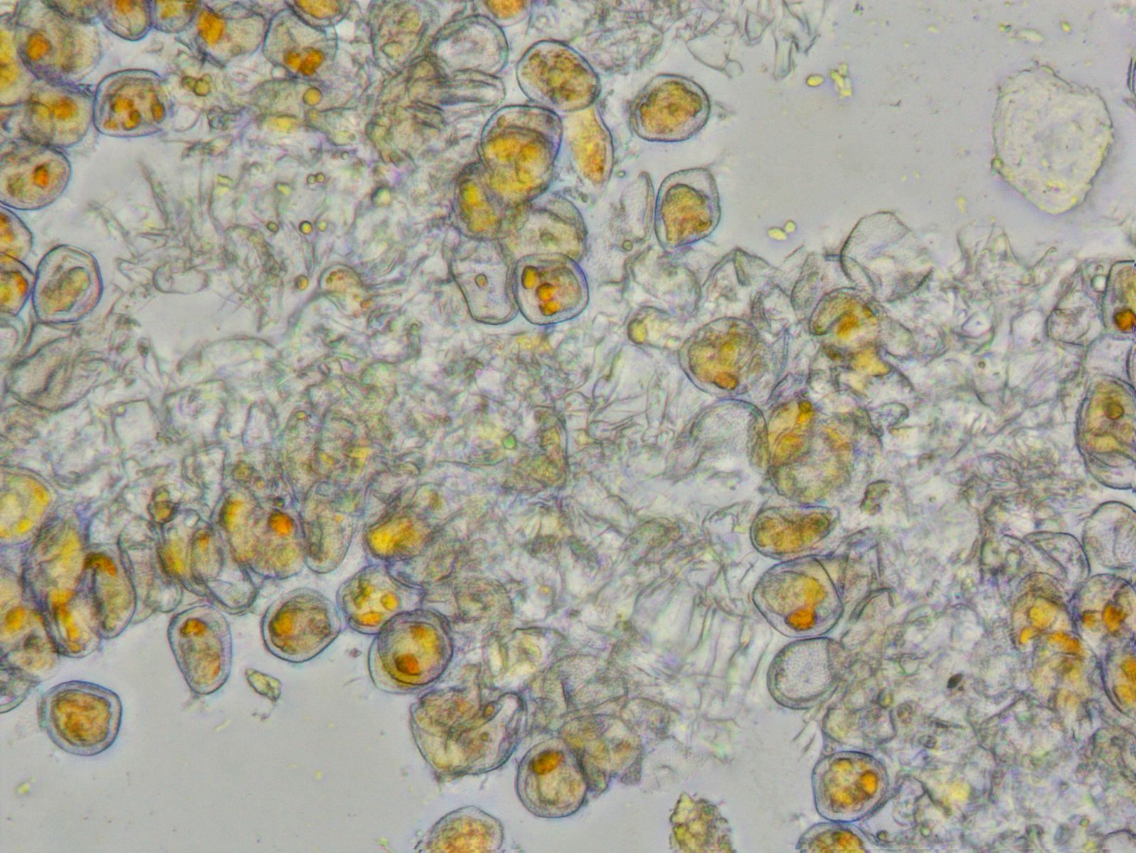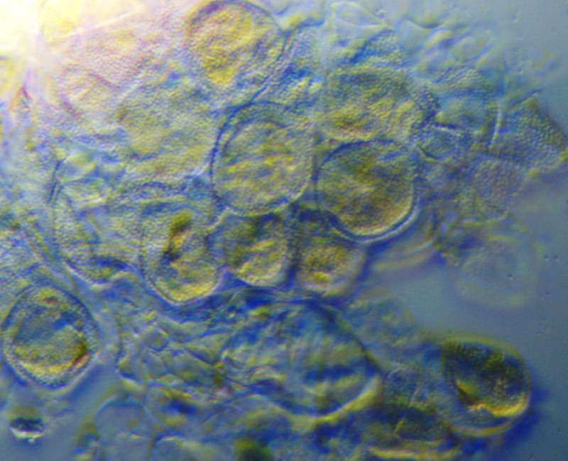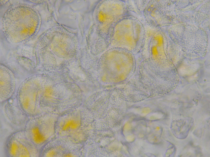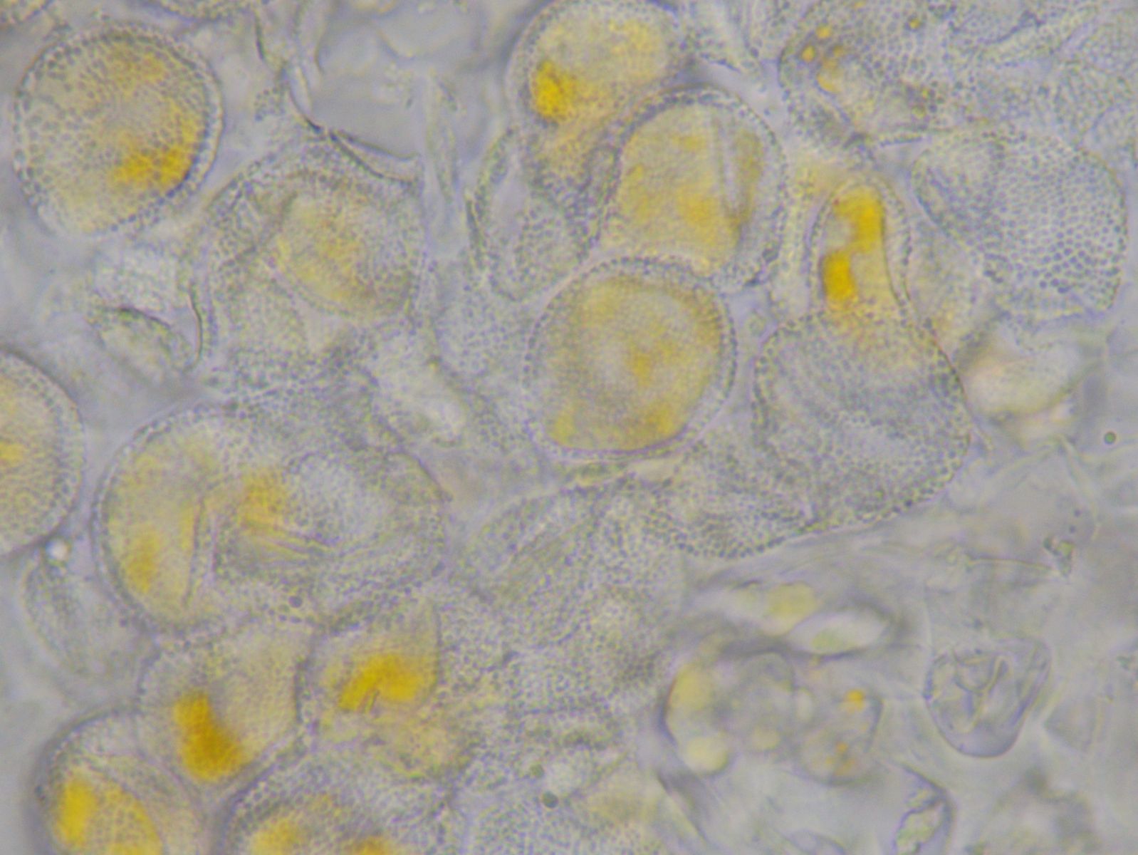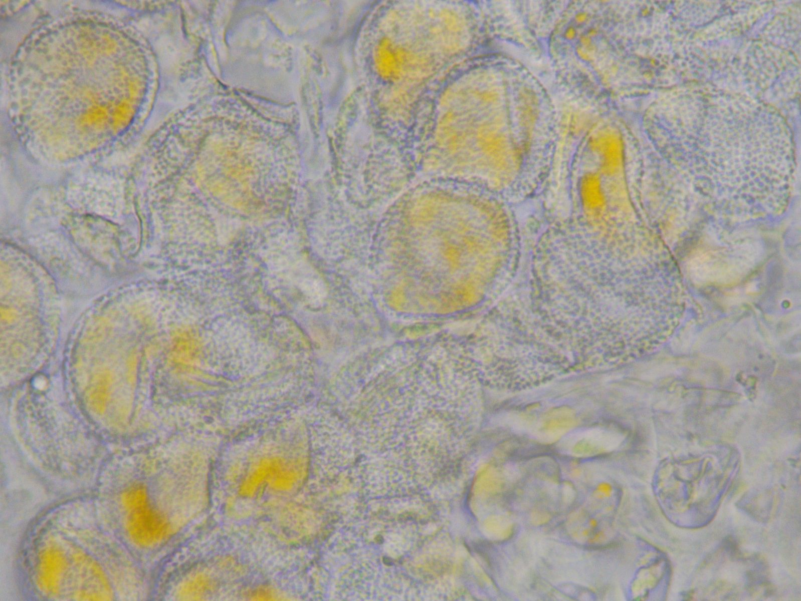 Hierzu habe ich aber eine Frage: Die ziegelsteinförmigen Gebilde sind ja sicherlich Bärlauchzellen, und die grünlichen Strukturen gehören vermutlich dazu. Aber etwas unterhalb und links unterhalb der Bildmitte sind kleine gelbe Punkte, die zumindest von der Farbe her so aussehen wie die Aeciensporen von der Unterseite. Und die scheinen ja entlang der Zellwand angeordnet zu sein. Hat das etwas mit dem Pilz zu tun?