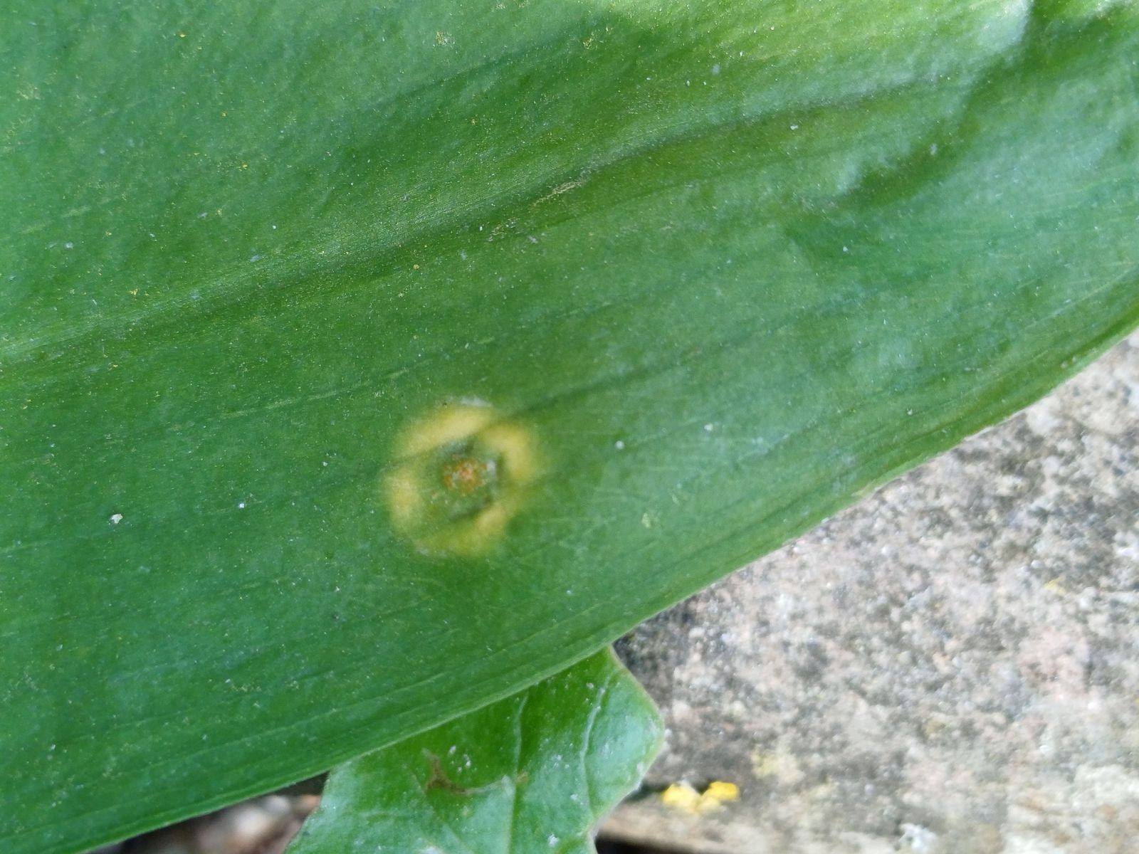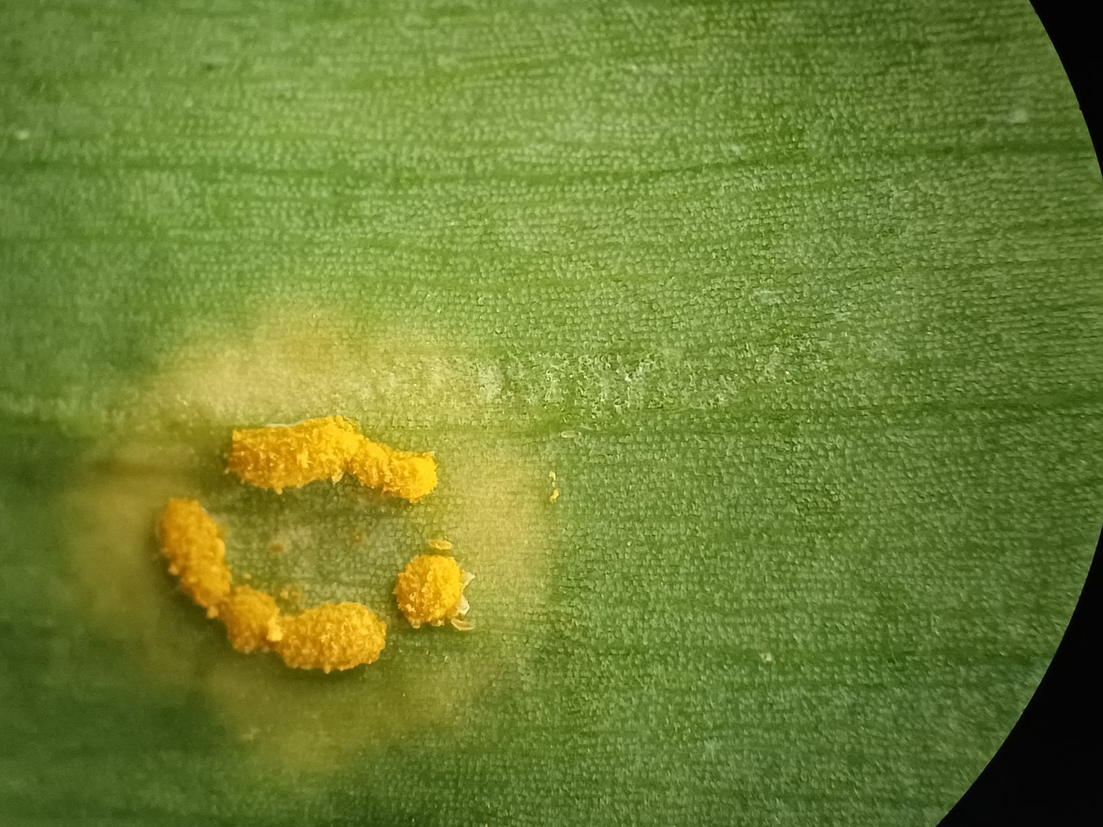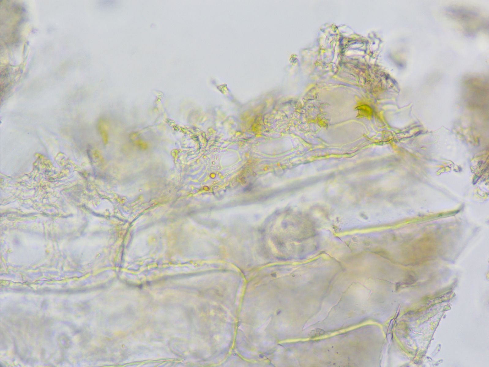 Hierzu habe ich aber eine Frage: Die ziegelsteinförmigen Gebilde sind ja sicherlich Bärlauchzellen, und die grünlichen Strukturen gehören vermutlich dazu. Aber etwas unterhalb und links unterhalb der Bildmitte sind kleine gelbe Punkte, die zumindest von der Farbe her so aussehen wie die Aeciensporen von der Unterseite. Und die scheinen ja entlang der Zellwand angeordnet zu sein. Hat das etwas mit dem Pilz zu tun?