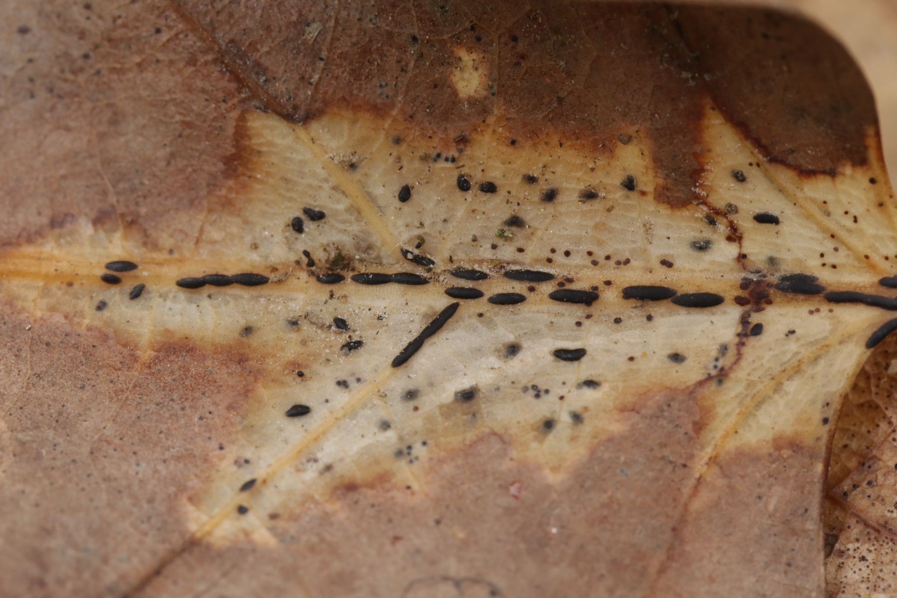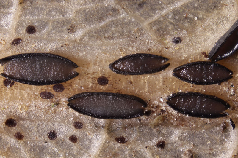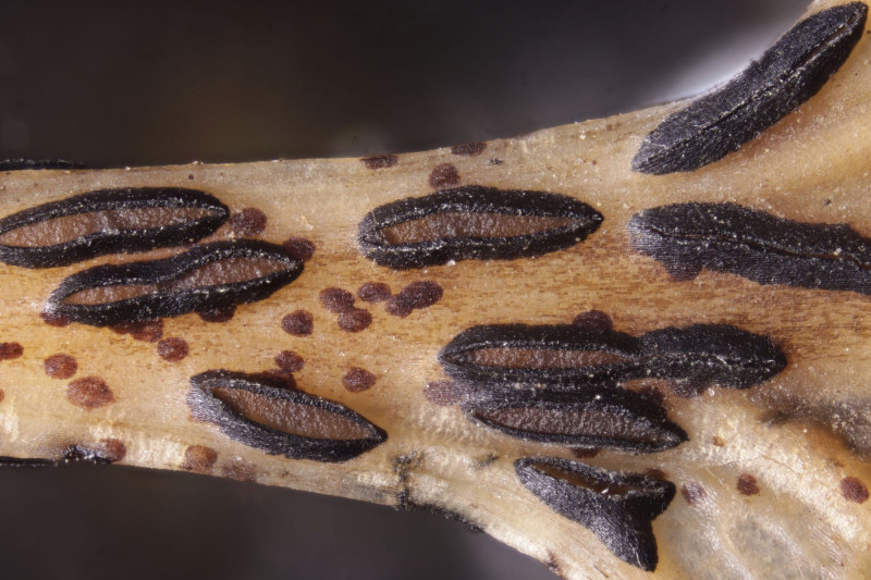 bei der APR-Exkursion am 12.4.2025 am Hohenstein in Witten konnten wir auf vorjährigen Blättern von Quercus rubra in großen Mengen Lophodermium petiolicola finden. Zum Fundzeitpunkt waren die Fruchtkörper noch nicht ganz ausgereift und entsprechend geschlossen.