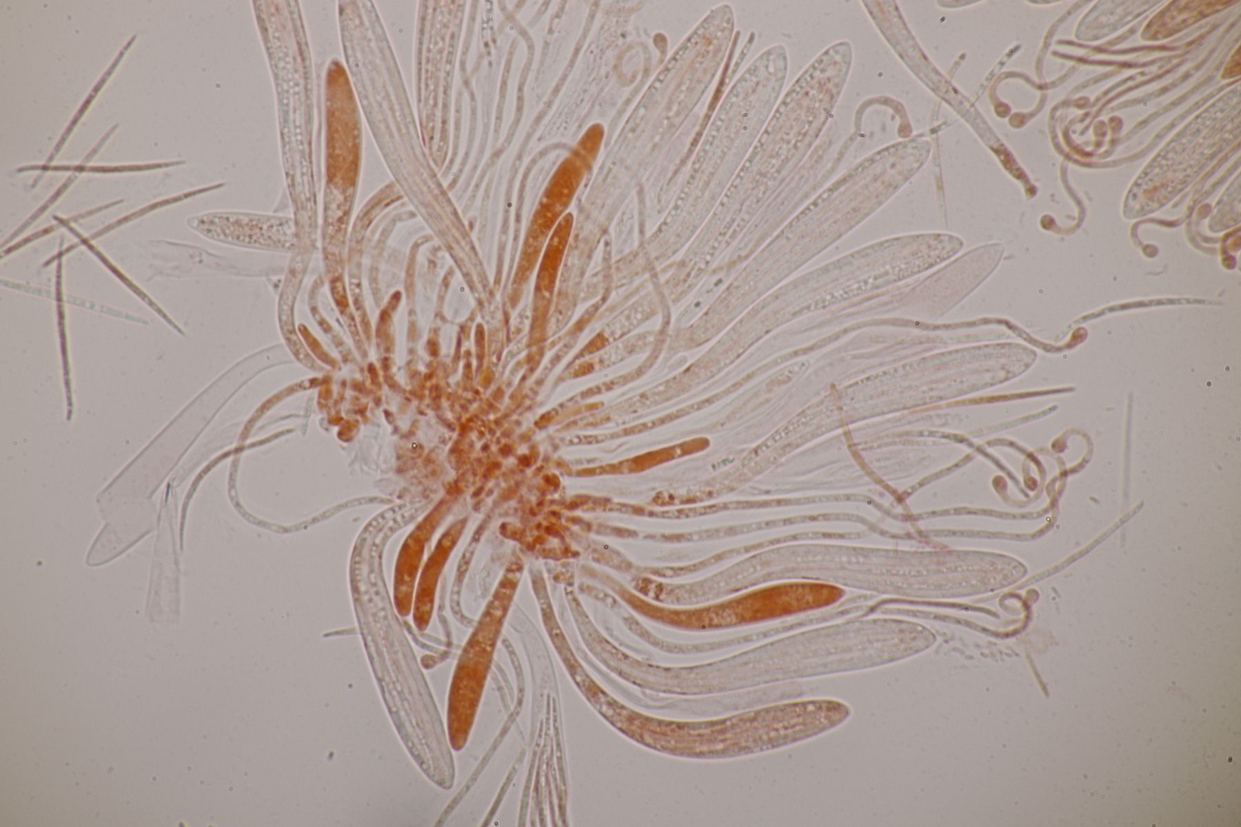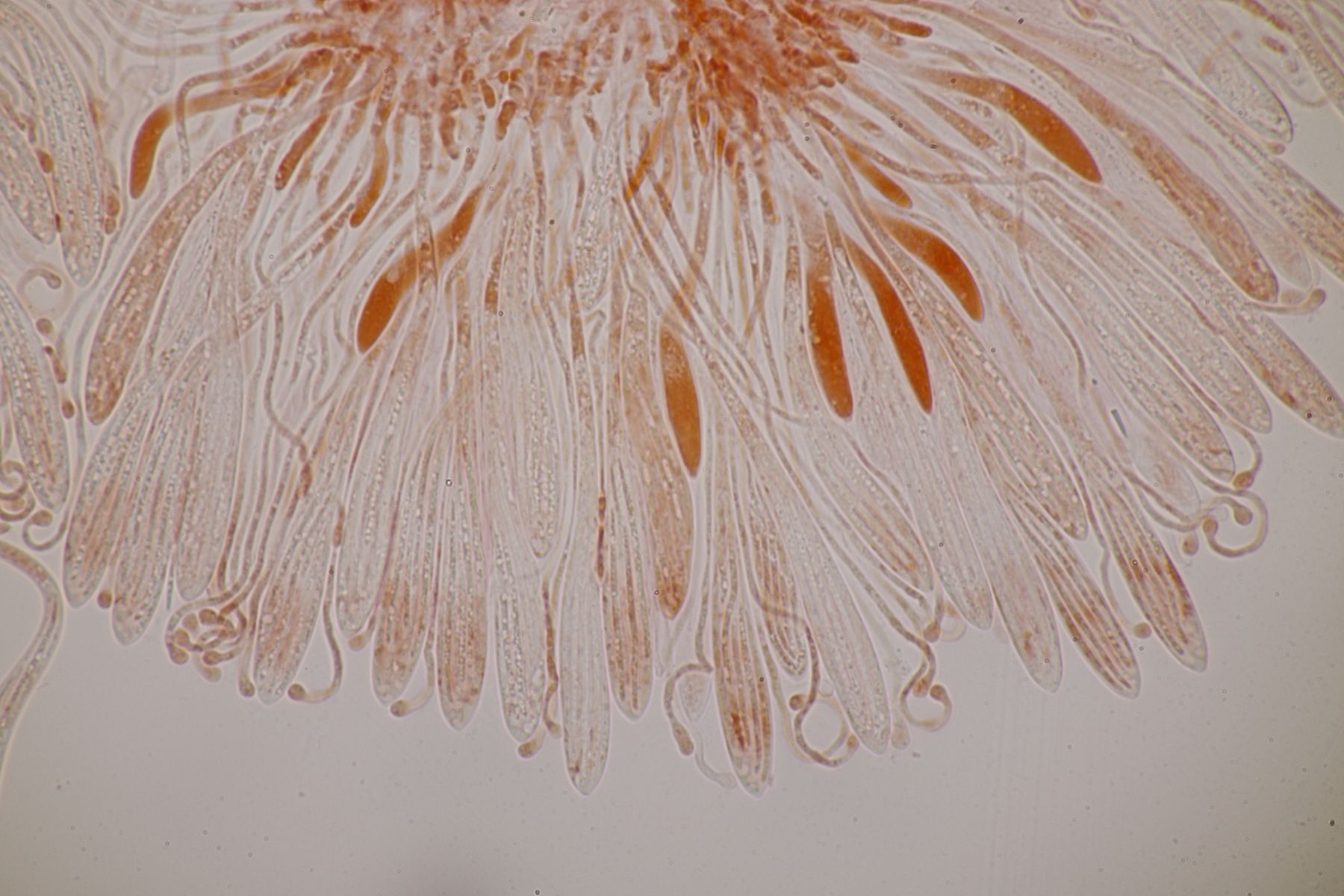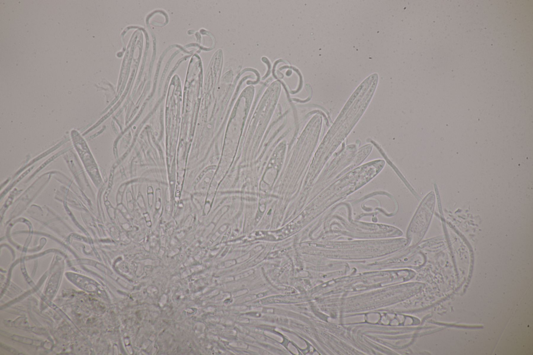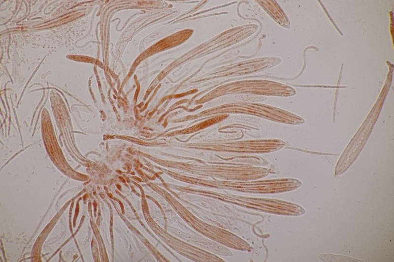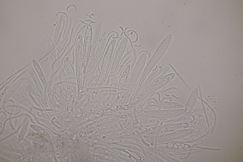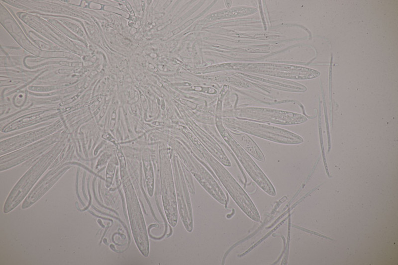Mikroskopisch findet man keulig-spindelförmige Asci, danaben Paraphysen, die teilweise etwas korkenzieherartig gewunden sind an der Spitze leicht verdickt sind. Die Sporen sind fadenförmig und einzellig.