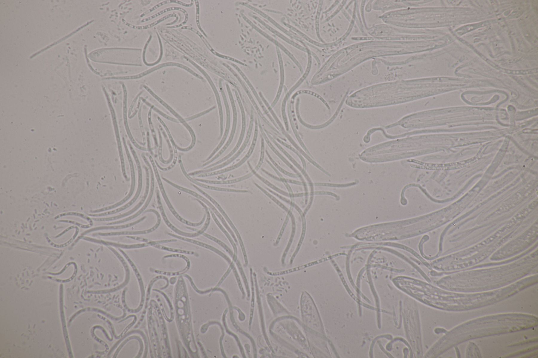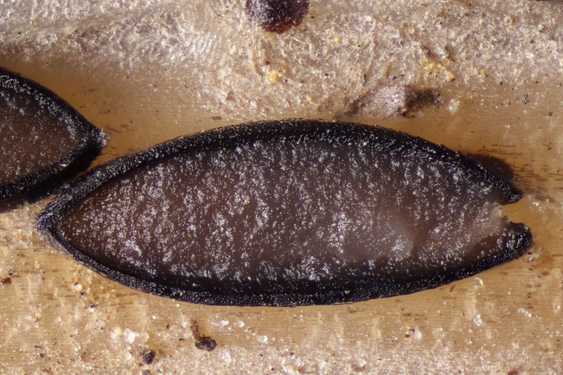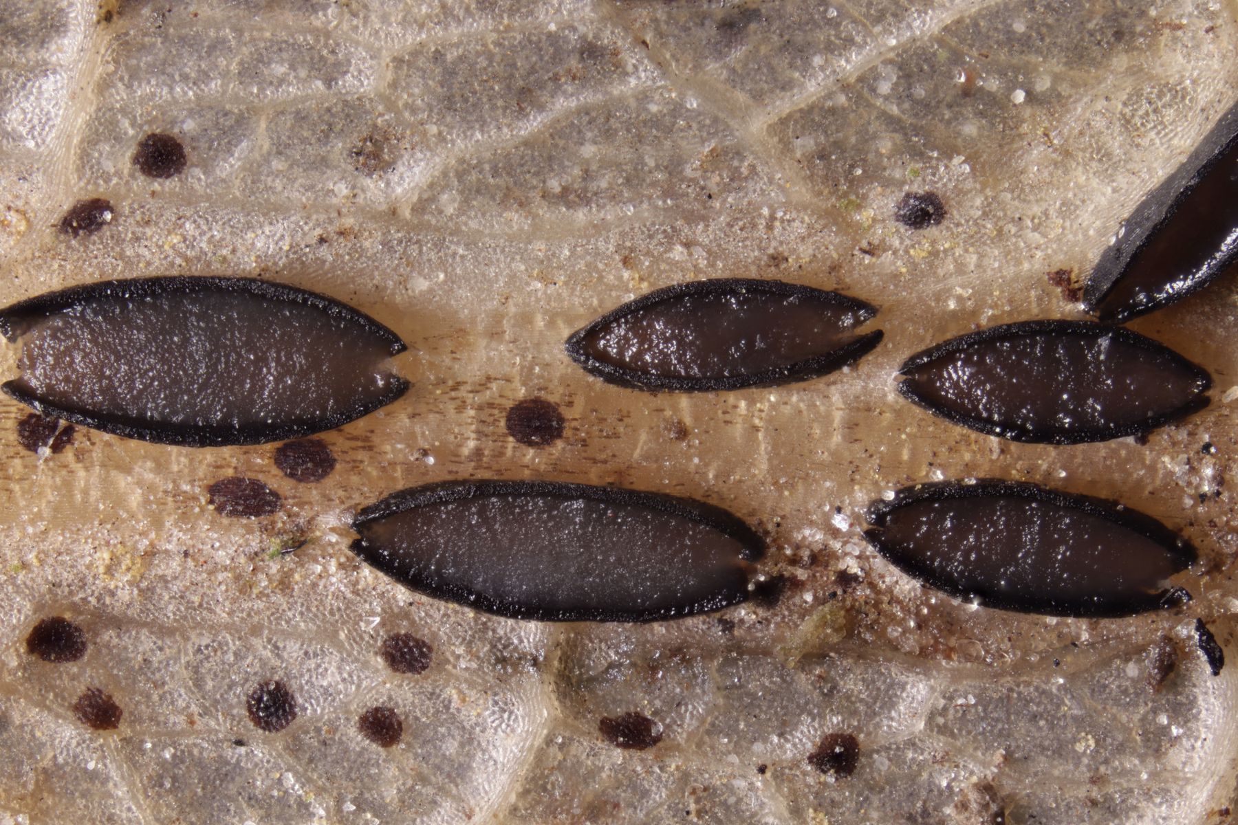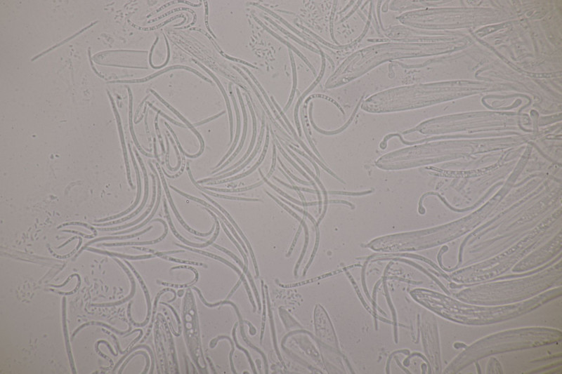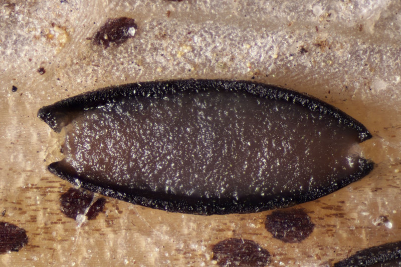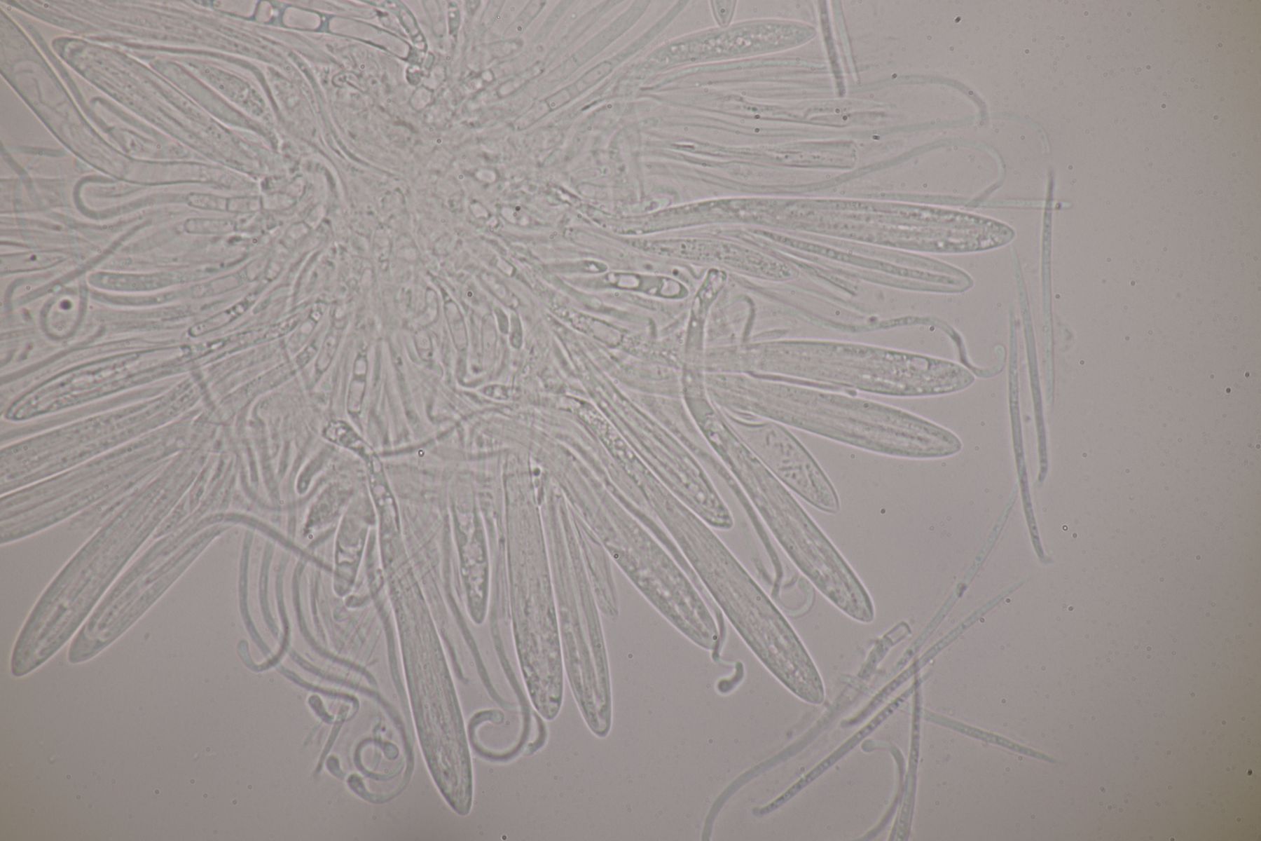 Mikroskopisch findet man keulig-spindelförmige Asci, danaben Paraphysen, die teilweise etwas korkenzieherartig gewunden sind an der Spitze leicht verdickt sind. Die Sporen sind fadenförmig und einzellig.