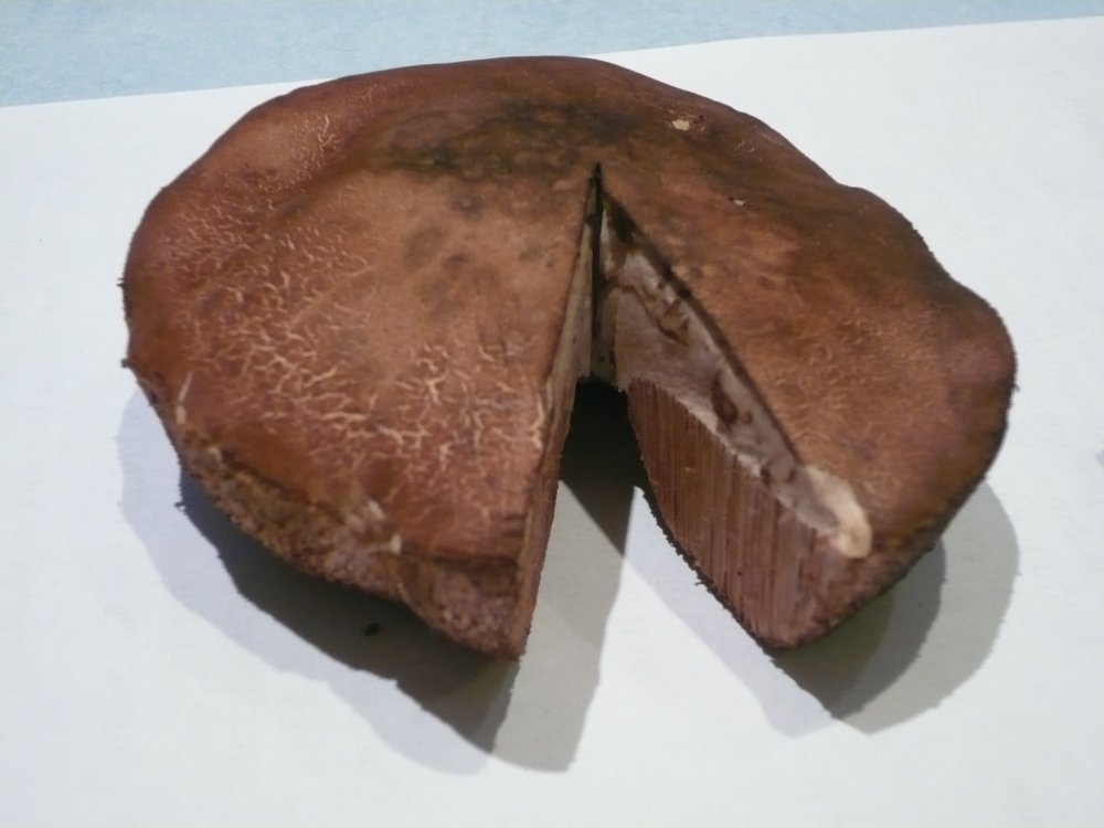 Hut dunkelbraun, d=8 cm, recht festes Fleisch, nicht schmierig