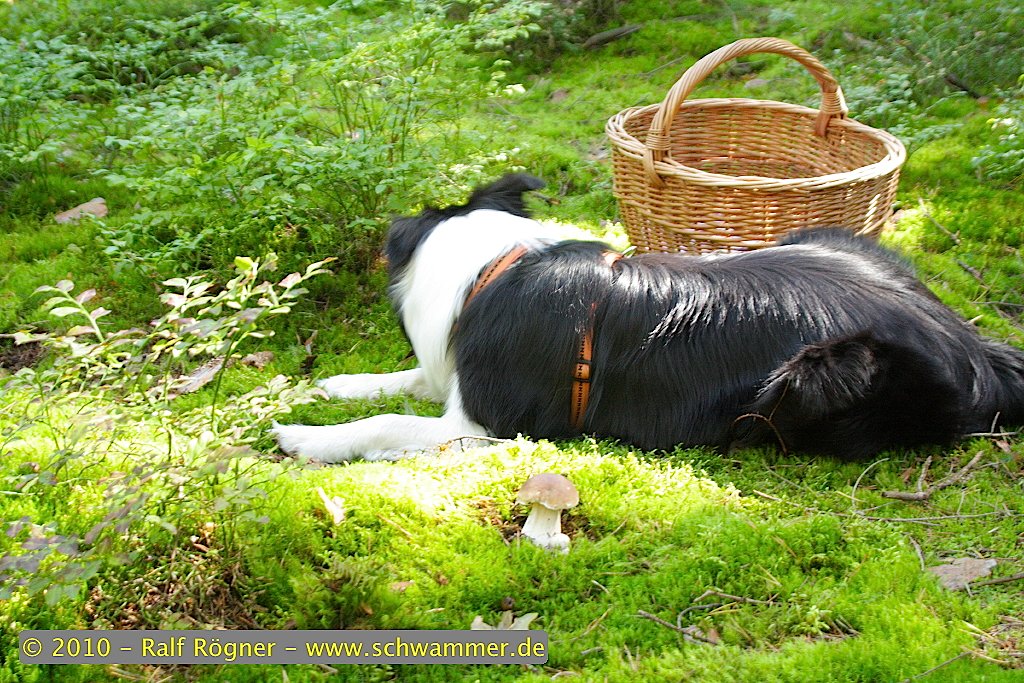 • Es ging heute später als gewöhnlich los, weil noch einiges zu erledigen war, aber gegen 13.00 Uhr habe ich mich dann endlich mit Molly in den Wald aufgemacht. Strahlender Sonnenschein, milde Temperaturen und gleich zu Beginn ein prima Auftakt: zwei wunderschöne Steinpilze. Nun gut, am Ende dann nur noch ein wunderschöner, denn Molly fand es bequem sich auf den Steinpilz zu legen, dessen Hut dann abbrach–¦ böses Mädchen!