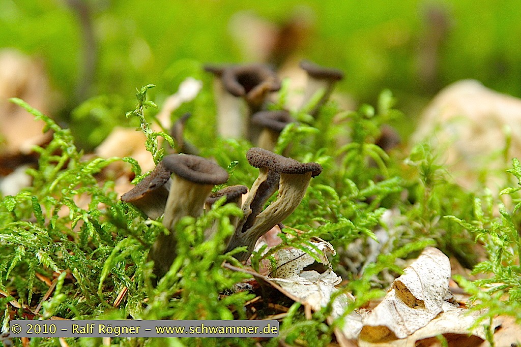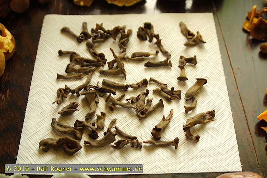 Den Trompetenpfifferling könnte man momentan mit der Sense ernten, denn er steht überall in so großer Anzahl büschelweise herum, dass es zeitweise unvermeidbar ist ihn zu zetreten –“ außer man kann fliegen.
