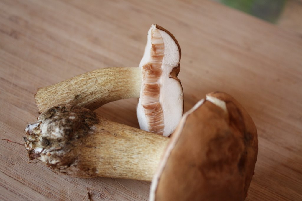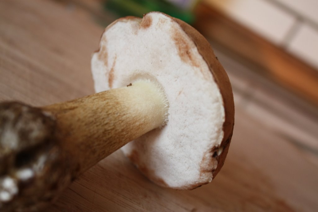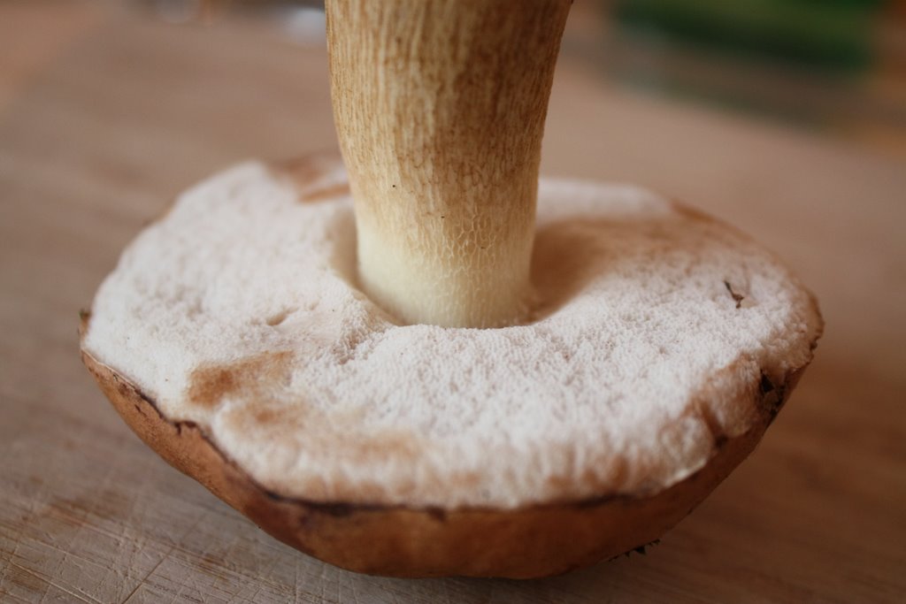 rote Poren, vor allem die Druckstellen, sowie das dunkle Netz am Stiel sprechen eindeutig für den Gallenröhrling.