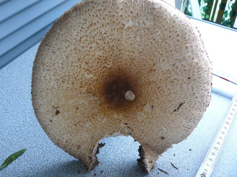 die Größe, braunschuppiger Hut, schuppiger Stiel und leichtes Gilben...das sieht sehr nach Agaricus augustus, dem Riesenegerling aus. Geruch und Geschmack müßten aber süßlich marzipanartig sein.