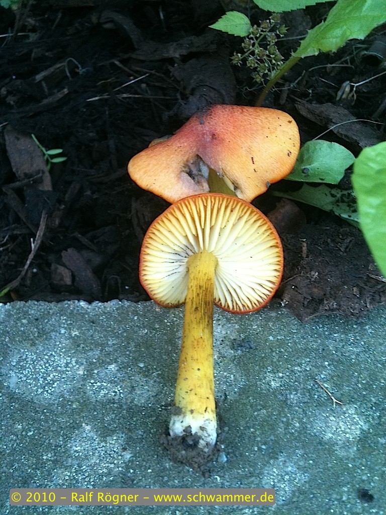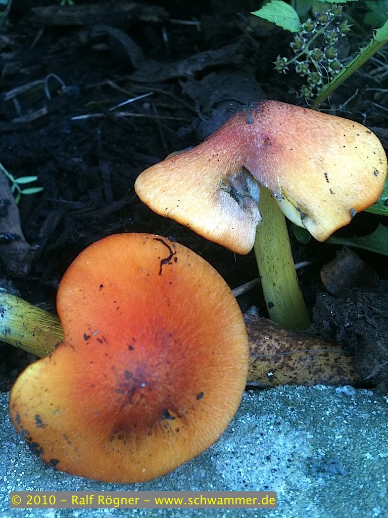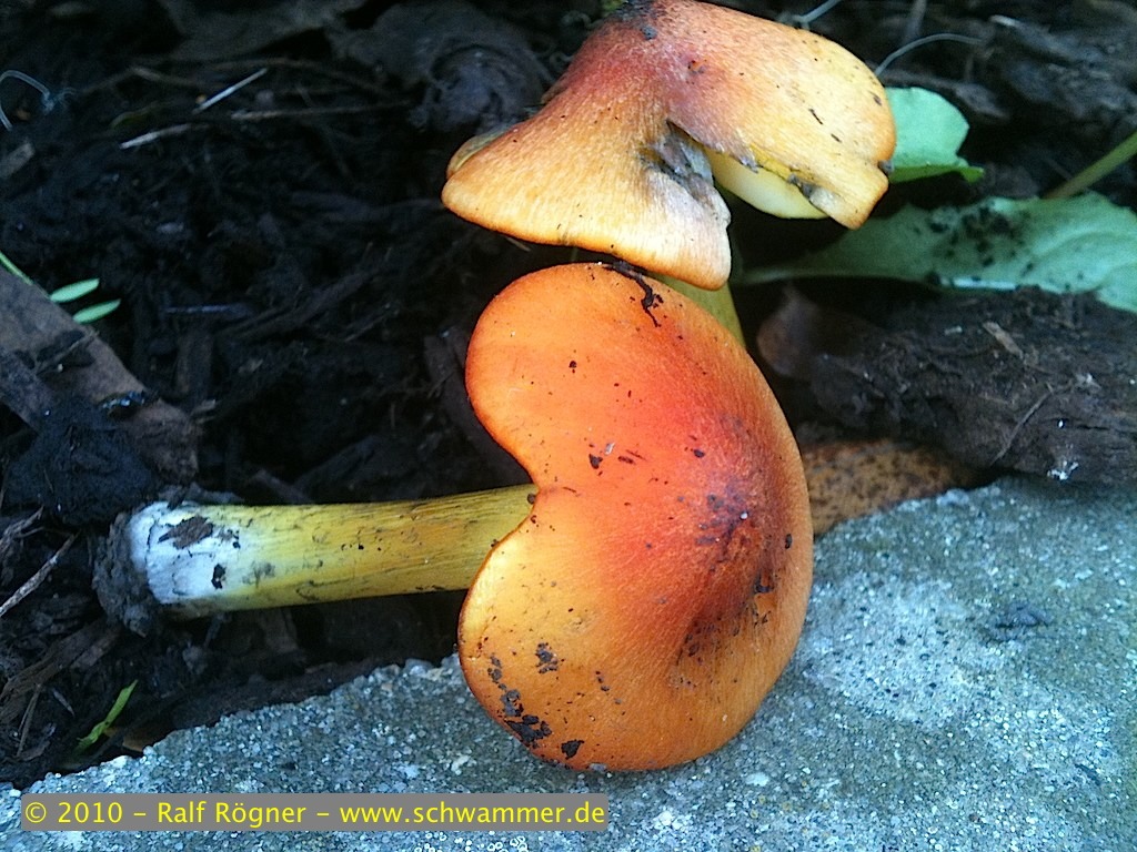 Diesen Pilz habe ich am 3. September direkt vor dem Gebäude meines Arbeitgebers entdeckt. Er wuchs im Schatten von Büschen (sorry, aber da stoße ich an meine Wissensgrenze) in einem frisch angelegten Beet, daß mit Rindenmulch bedeckt worden war. Die Fotos sind leider nur mit meinem iPhone gemacht, so dass die Bildqualität lediglich als "akzeptabel" zu bezeichnen ist. Größe des Pilzes betrug ca. 4-6 cm, Geruch unauffällig, lediglich diese zwei Exemplare waren zu finden. Der Stiel verfärbte sich im Laufe der Stunden immer dunkler. Ist leider schon 10 Tage her, so dass ich auch kein Referenzexemplar mehr vorweisen kann... ![]()