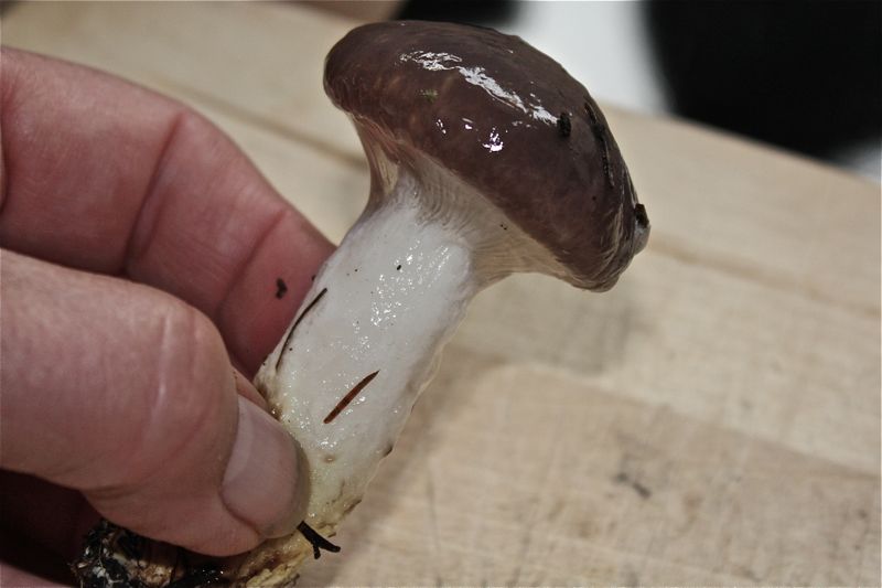 Bei dem kleineren ist der Hut mit einer schleimig klebrigen Haut überzogen und am Fuß ist er Zitronengelb.