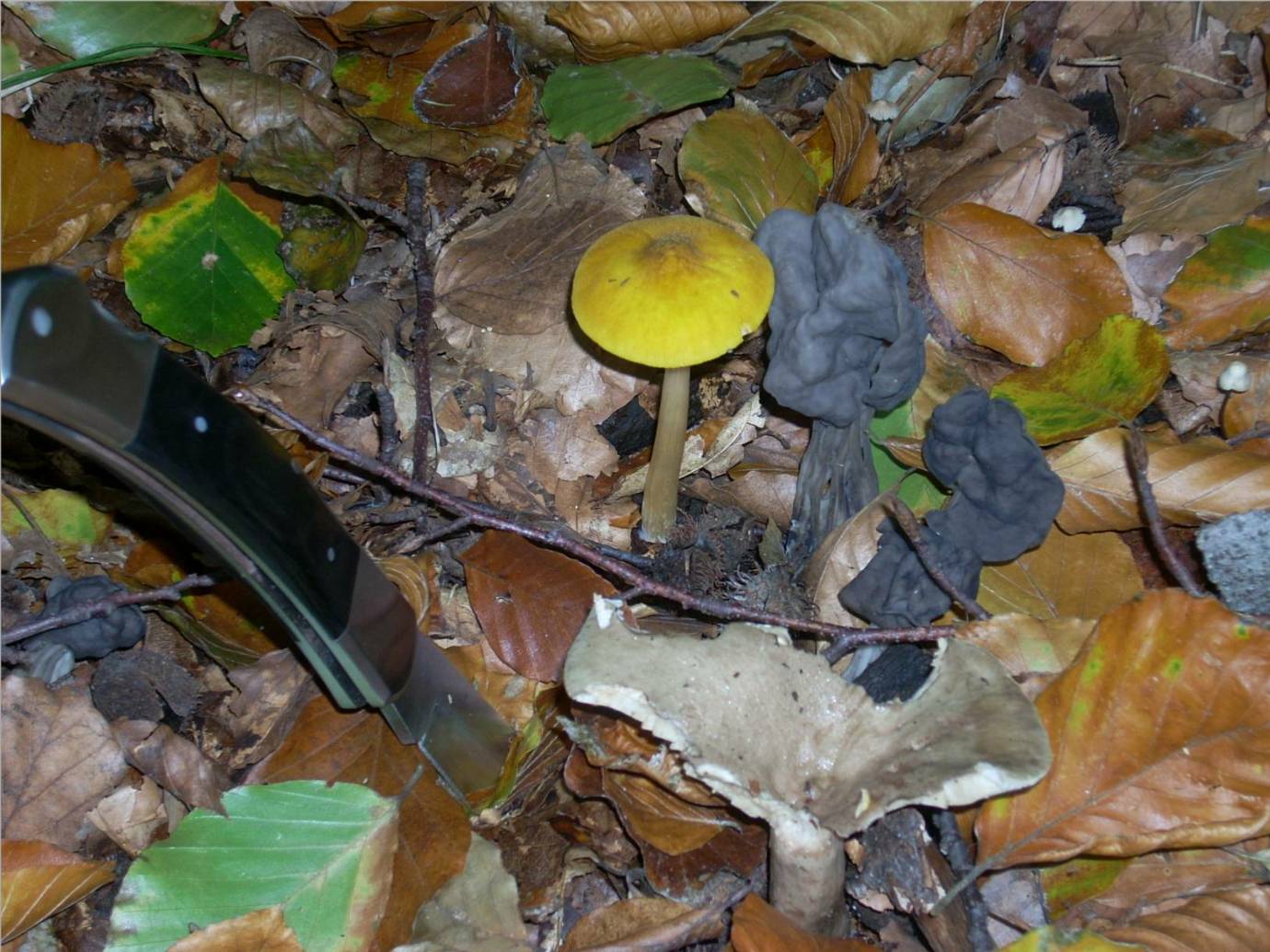 Bild 1 links Pluteus leoninus (Löwengelber Dachpilz), rechts daneben Grubenlorchel (Helvella lacunosa), drunter ein Milchling (L. blennius wäre eine Möglichkeit, aber wie gesagt.......)
