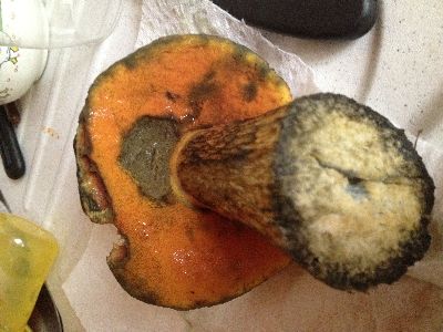 Vom Aspekt hat sah der Pilz aus wie ein Birkenröhrling und roch auch nicht irgendwie unangenehm. Beim Putzen und Schneiden hat sich allerdings der Fuß nahezu sofort (vielleicht 10 Sekunden) intensiv grünlich verfärbt, ebenso etwas langsamer das Fleisch des Hutes. Das ganze ist dann nach einigen Minuten ins Blau übergegangen. Ehrlich gesagt habe ich mich daraufhin ordentlich erschreckt und den gesamten Pilz entsorgt..