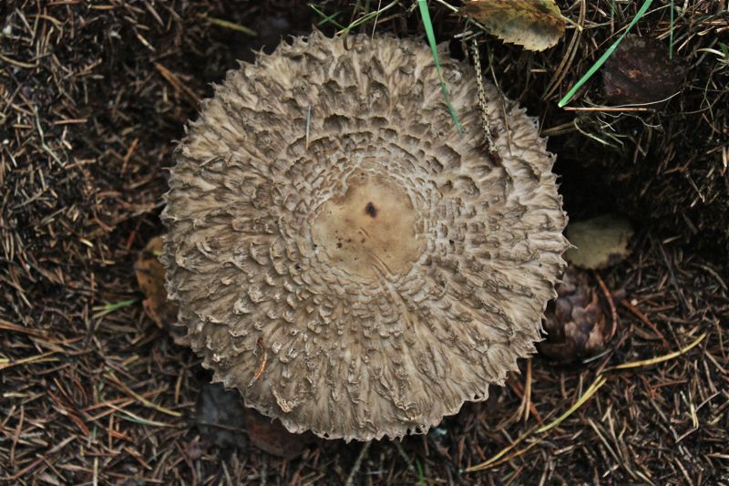 - Bereits ein Größenvergleich (Hutdurchmesser vs. Blätter /Nadeln) und auch die Ausprägung der Hutschuppung/des Huts zeigt, dass dies kein "Jungfernschirmling" sein kann.