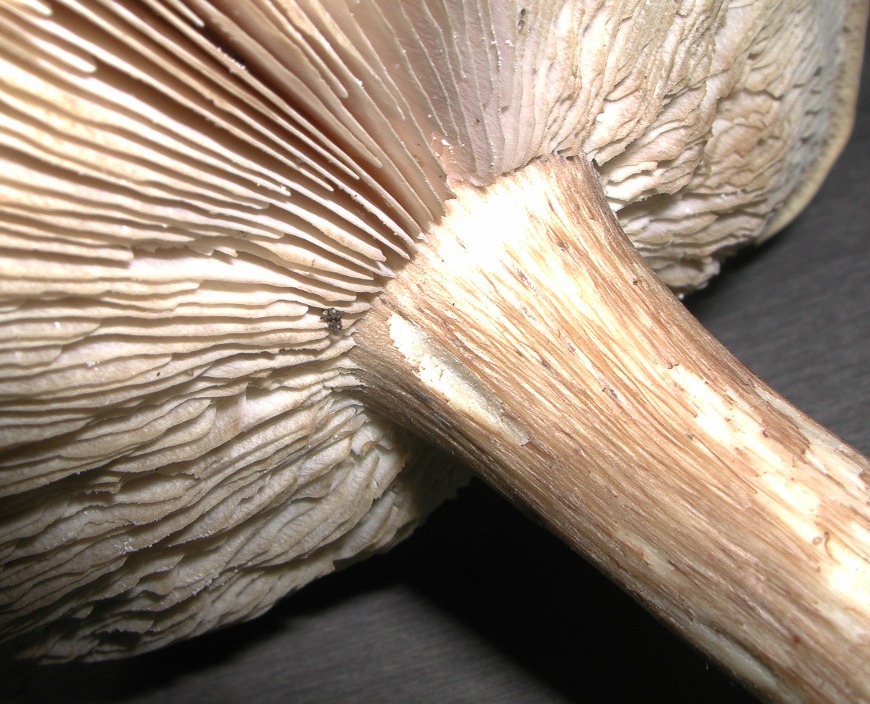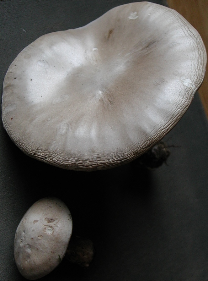Für Ritterlinge spricht ihr Aussehen auf den ersten Blick. Sie sahen aus, wie graue schmale Rötelritterlinge, die ich auf der Hutoberseite oft schon sehr blass und grau fand. Auch das Wachsen auf gut dedüngter Wiese im Kreise stehend würde passen... Ein Blick auf die Unterseite enttäuschte jedoch - hier sind üblicherweise Violettönte, die hier absolut fehlten. Der Geruch, sonst für mich bei Lepista sehr charakteristisch war nur sehr schwach - vielleicht standen die Pilze zu lange? Verwundert war ich auch über den relativ dünnen Stiel.