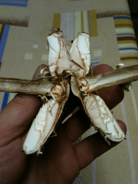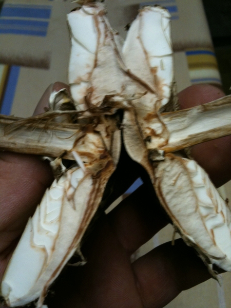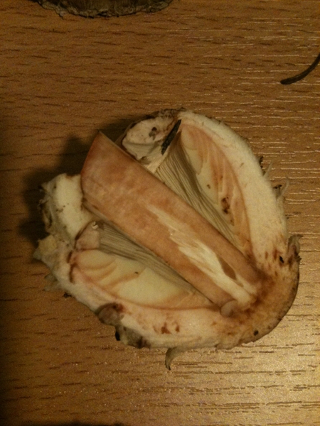 Schnitt an der Stielbasis rötet langsam nach ca. 5 Min. dunkelrot.