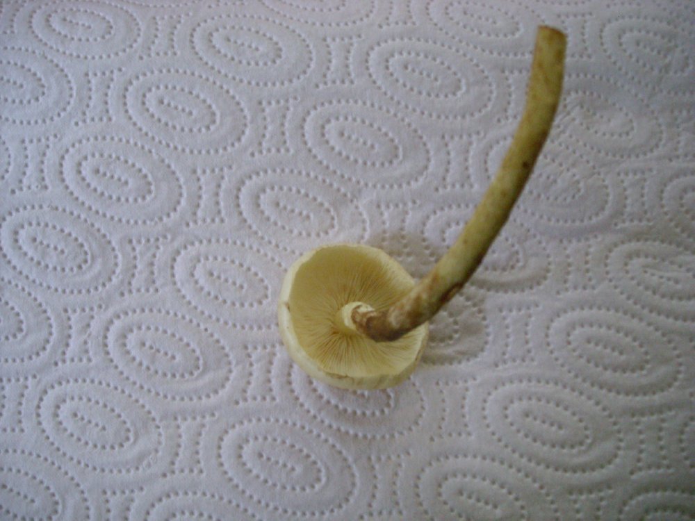 So nun habe ich nochmal ein paar Bilder gemacht und den Pilz mal angeschaut, also der Schirm hat einen Durchmesser von ca 5 cm, der Stiel ist zwischen 5 bis 10 cm lang und innen hohl, riechen kann ich nichts besonderes, die Lamellen unterm Schirm sind schmal und eng. Der Pilz ist trocken und nicht irgendwie schmierig o.ä.