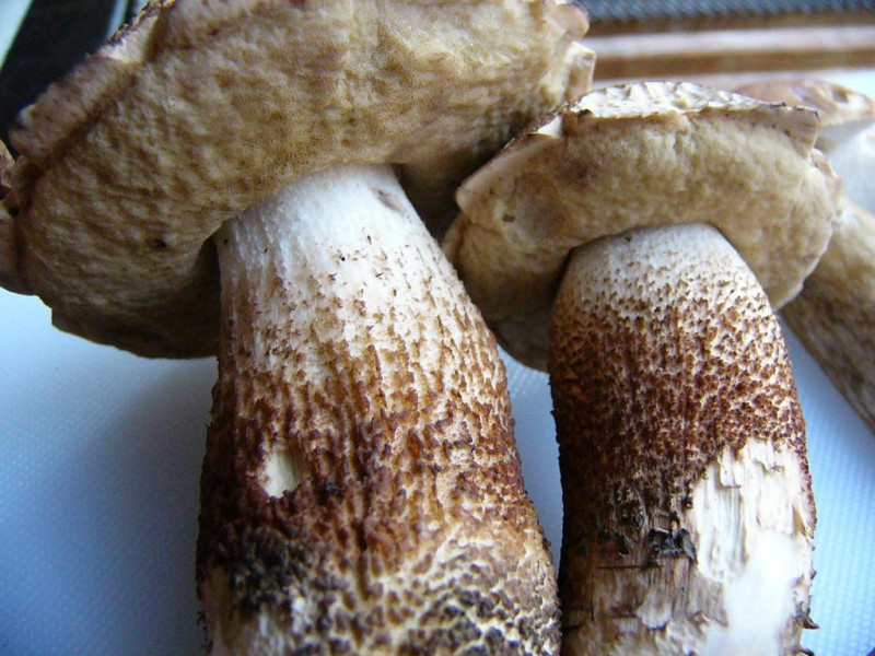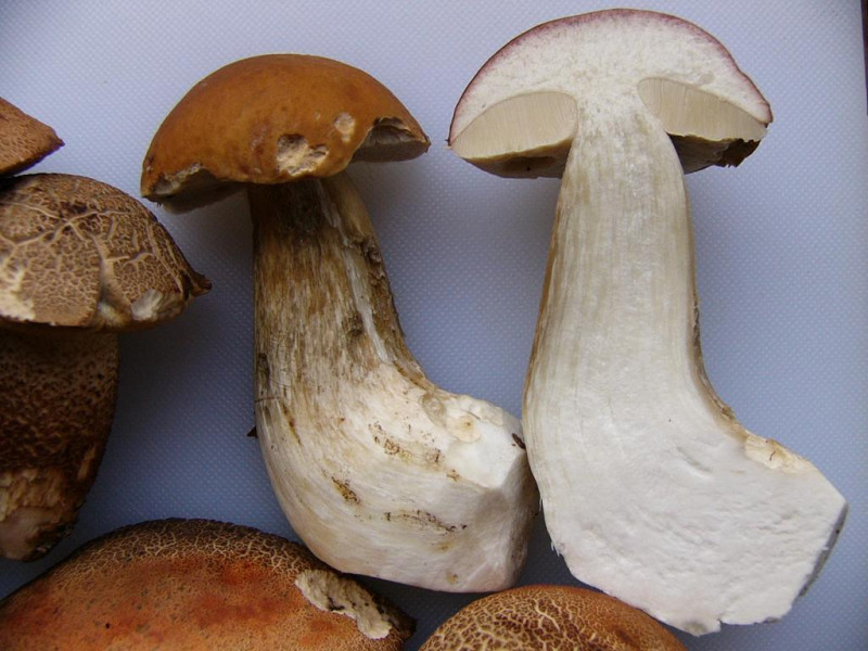 Die Exemplare mit rostbrauner Beflockung des Stiels zeigten im Schnitt nach einiger Zeit eine Schwarzfärbung (im Foto erst ansatzweise zu sehen, da nach dem Schnitt erst einige Sekunden vergangen waren).