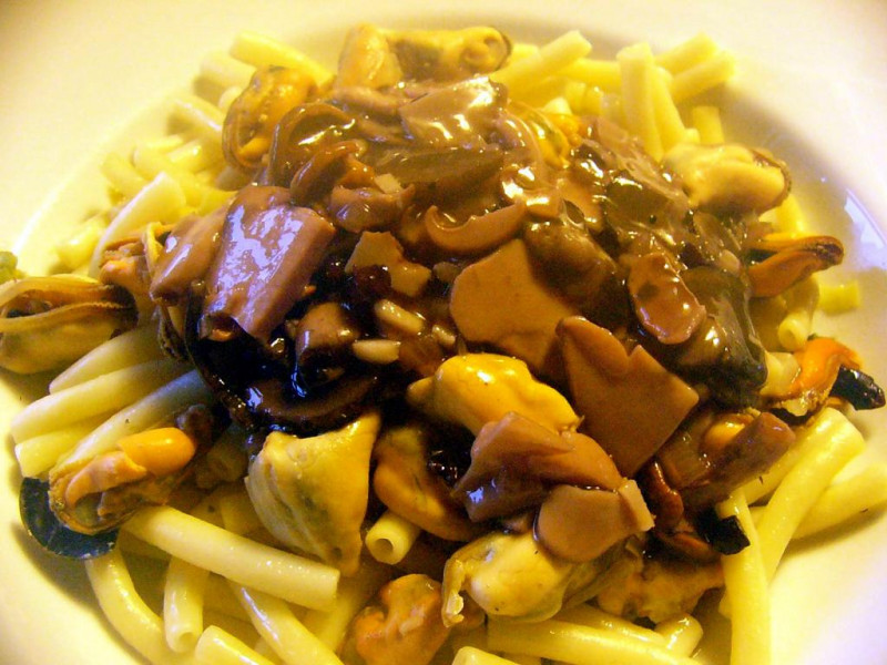 (Miesmuscheln, gedünstet in Sherry mit Rotkappen-Steinpilz-Pfifferlingssoße...)