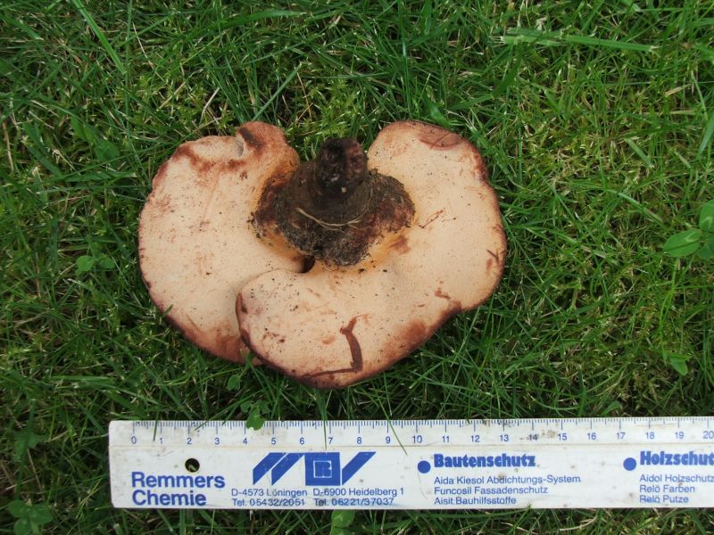 Unterseite: sehr feine schwammartige Struktur, Farbe creme/ helles beige, rote Streifen an den Rändern.