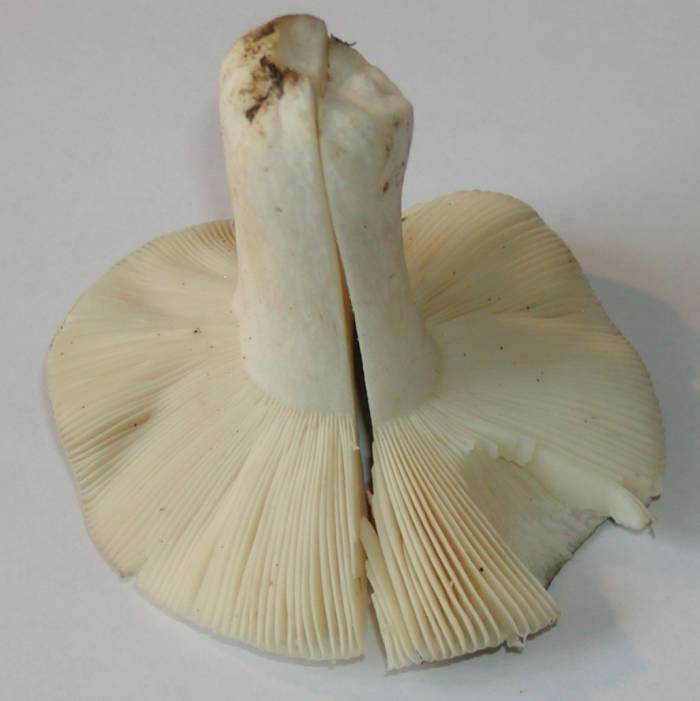Alle gefundenen Exemplare sind grau, die älteren haben in der Mulde gelblich bräunliche Verfärbungen. Die Huthaut ist von Rand her bis zur Mulde abziehbar, Geschmack zunächst mild, dann leicht nachschärfend, Geruch unbedeutend (allerdings: mit verschnupfter, freigesprühter Nase). Brüchigkeit... hmpff, ja so mittel. Der Ausblassende war brüchiger.