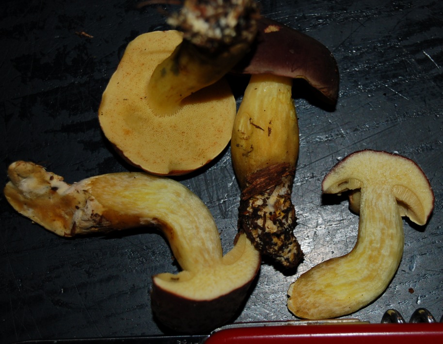 Der macht mir Probleme wegen seines gelben Fußes, ich habe nichts passendes gefunden. Hutfarbe ins Ocker gehendes Braun wie die der umstehenden Rotfußröhrlinge, allerdings keinerlei Rotanteile an Hut, Röhren oder Stiel.