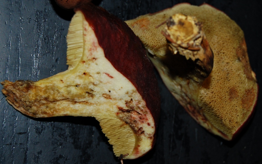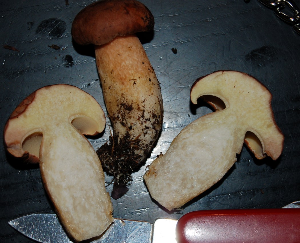 Der macht mir Probleme wegen seines gelben Fußes, ich habe nichts passendes gefunden. Hutfarbe ins Ocker gehendes Braun wie die der umstehenden Rotfußröhrlinge, allerdings keinerlei Rotanteile an Hut, Röhren oder Stiel.