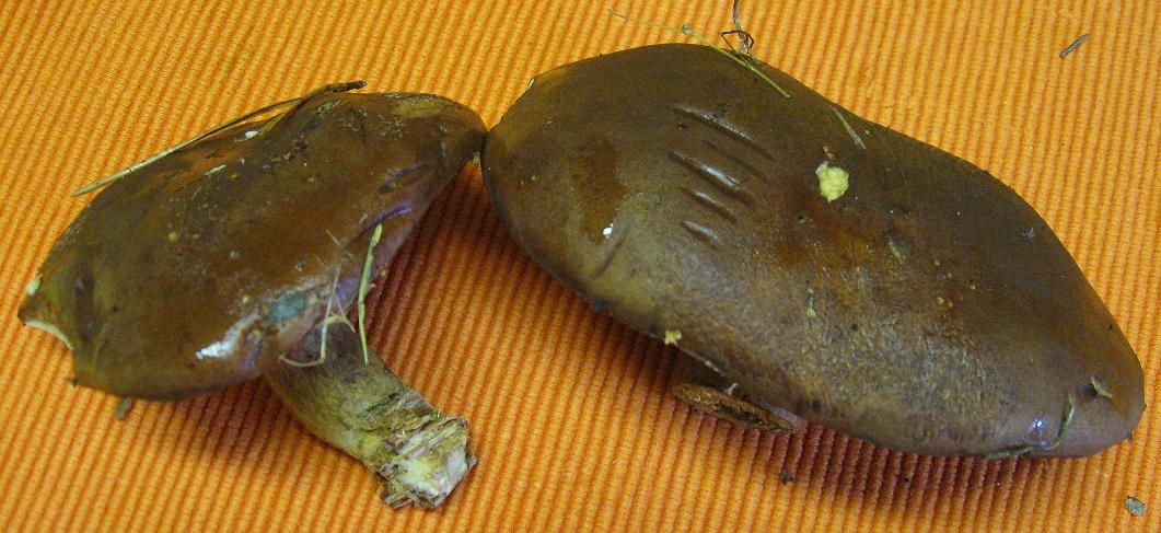 Aber ebenfalls unter Kiefern, aber auf kalkigem Boden, wächst auch der Ringlose Butterpilz (S.collinitus),