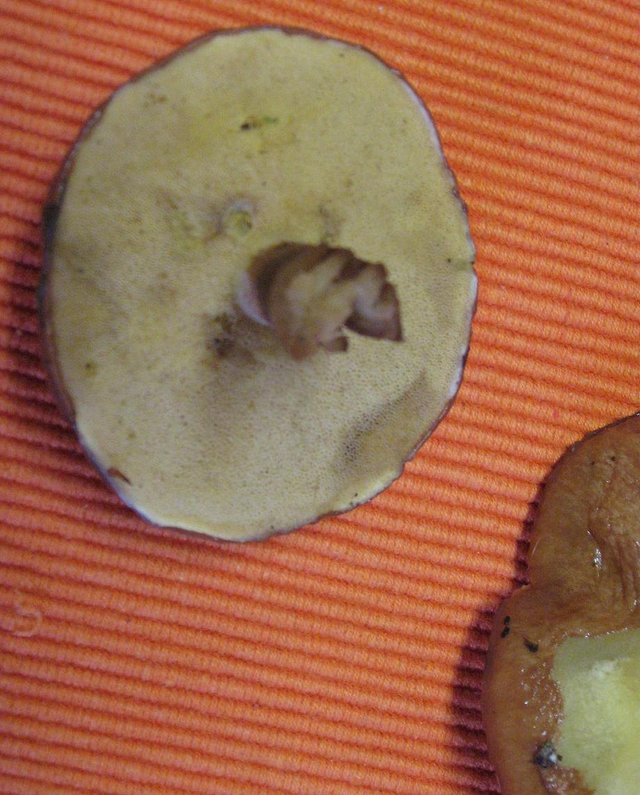 2. Maronenröhrling, Fichtenwald, Röhren bei Druck schnell blauend.