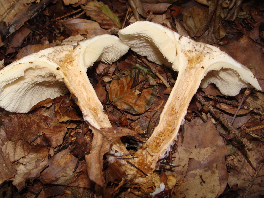 Der stiel war glatt und die lamellen endeten auch dort, also sie hatten keinen fließenden übergang. Eine knolle konnte ich auch nicht erspähen. Euch gibt es keinerlei verfärbungen durch das anschneiden. Der stiel war sehr brüchig und nicht fest. Fundort auf einer lichtung am rande eines Nadelwaldes.