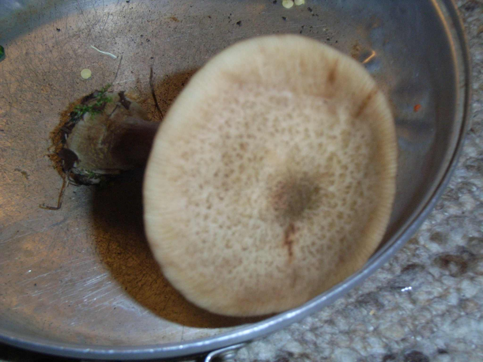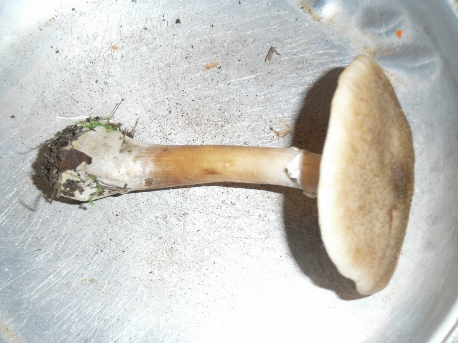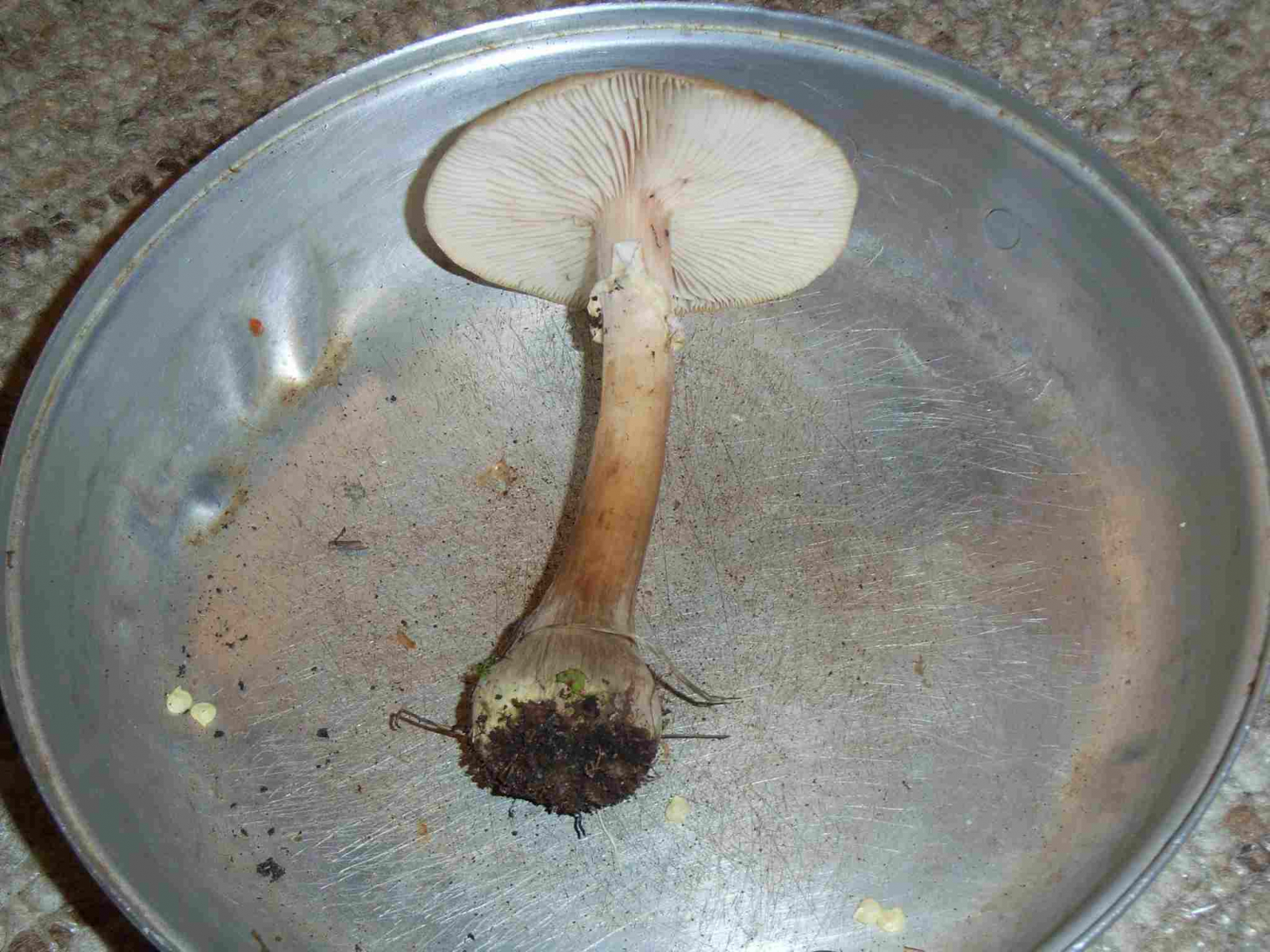 Blätterpilz, Schirmdurchmesser ca. 7cm, Oberfläche hellbraun bis beige, leicht schuppig, an den Rändern Blätterstruktur durchscheinend.Stiel ca. 10cm unten Knolle sonst ca. 1cm Durchmesser. Unten dunkelbraun nach oben deutlich heller.