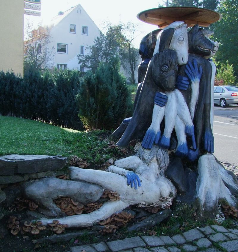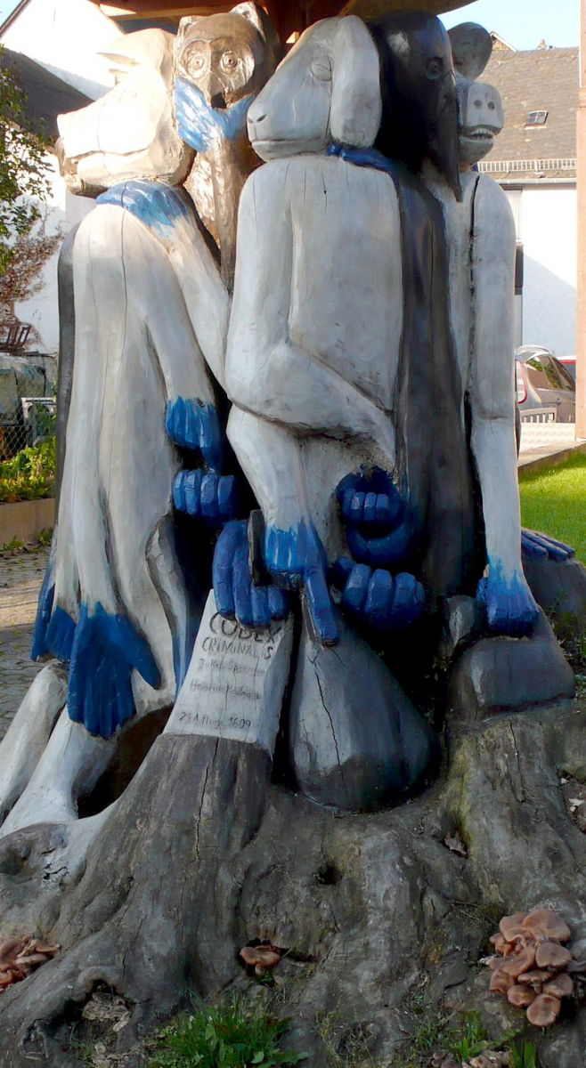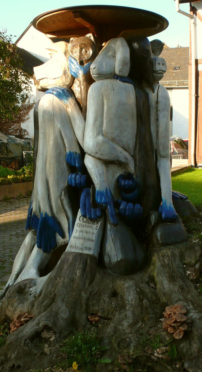 hab noch mal recherchiert: Der Künstler und Lehrer Marco Lutz aus Dachsenhausen (nähe Koblenz) hat aus einem altersschwachen, abgesägten Baumrest ein Kunstwerk geschnitzt. Die "Untiere" (9 an der Zahl) verkörpern das Hohe Gericht, das Anno 1666 die Anne Färber zum Tode verurteilt. Die