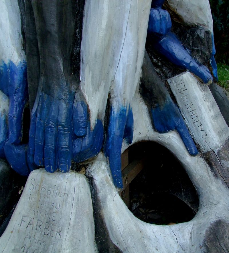 1. der Künstler hat aus dem Baumstumpf in seiner Art einen grausamen Hexenprozess aus dem Mittelalter geschnitzt,